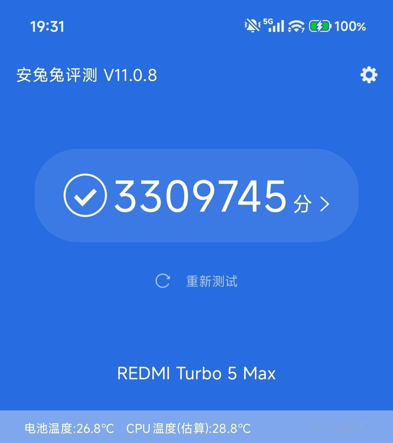 懒酱对REDMI Turbo 5 Max 进行了简单的性能测试。REDMI Turbo 5 Max 首发搭载了天玑 9500s 芯片,采用旗舰3nm制程和全大核架构,CPU为“1+3+4”全大核设计(1×3.73GHz Cortex-X925超大核+3×3.30GHz X4核+4×2.40GHz A720核)。集成12核Mali Immortalis-G925 GPU,主频达1.61GHz,配备29MB超大缓存组合(L2/L3+系统缓存)。搭配 LPDDR5X Ultra + UFS 4.1,称得上黄金搭档了。实测性能上,安兔兔“极限跑分”330万,常温下跑分319万。而在游戏测试中:轻松应对《王者荣耀》*是毫无疑问的,在室温23.2°C下,进行三把5v5排位对局(共持续半小时),每把约4.2W的功耗,平均120.1帧、5% Low帧119.8,无限接近一条直线。《原神》*一命夜兰须弥城跑图,4.67W的功耗,平均60帧、5% Low帧59.2。除非后续大家把渲染分辨率都提到2K吧,目前中端机都能轻松应对《原神》,提供测试数据方便大家“赛博斗蛐蛐”罢了。温度控制也是相当不错了,在23.8°C室温下,高强度跑半小时须弥城,手指能碰到的背板温度也就30°C出头。《崩坏:星穹铁道》*也是相当可以了,997P分辨率下拉满配置,跑小时“黄金的时刻”,7W多一点的功耗,平均59.3帧、5% Low帧55.1。相比起早前“极客湾”的测试,没有他这么激进(功耗和温度),后半段帧率也比他稳,可能我测试的版本跟他不一样?上了更新的优化?可以确定的是,游戏调教是没有问题的。中端的价格,实现好看的外观,非常不错的游戏性能,还有充电宝一般的9000 mAh 超大电池(实在懒得测实际续航和充电功率了,估计我要跑很多安兔兔才能把电耗完),真的可以“既要又要”了。最后一点碎碎片:这次性能测试还是有点遗憾的,被生活的琐碎事耽误了,要不然把现在最火的《明日方舟:终末地》也一起测了(刚打完开局的boss,不知道还要过多久剧情才能进行跑图测试),如果大家对 Max 游戏性能感兴趣,我找个时间测试一下?《鸣潮》我也想测,毕竟我为了游戏测试还特意去买了个账号 ... Turbo5Max满配性能旗舰 -- 我是小字注释 -- * 《王者荣耀》测试环境:23.2°C、WiFi、手动固定一半亮度、狂暴模式、极致画质HDR特效全开120Fps、5vs5 30min * 《原神》测试环境:23.8°C、WiFi、手动固定一半亮度、狂暴模式、渲染精度极高特效全开60Fps、Vulkan、关闭动态模糊、须弥城30min * 《崩坏:星穹铁道》测试环境:23.6°C、WiFi、手动固定一半亮度、性能模式、特效全开60帧,Vulkan、黄金的时刻30min * 系统版本为3.0.5.4 * 测试数据基于三方应用Scene读取统计,性能狗太贵了用不起,Kite 没有直接提供的Low帧数据,直接拿Scene测试吧。