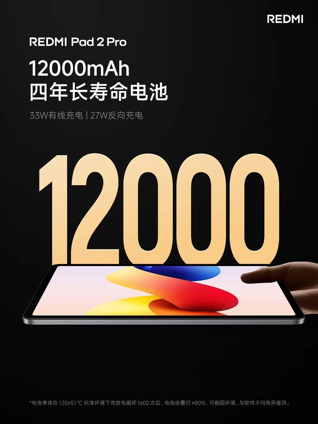 红米新平板,看起来性价比是有点高的,12,000毫安时的电池加33瓦的充电,然后这个屏幕还是一个护眼屏,用来给小孩上网课,看教育视频很合适啊REDMIPad2Pro