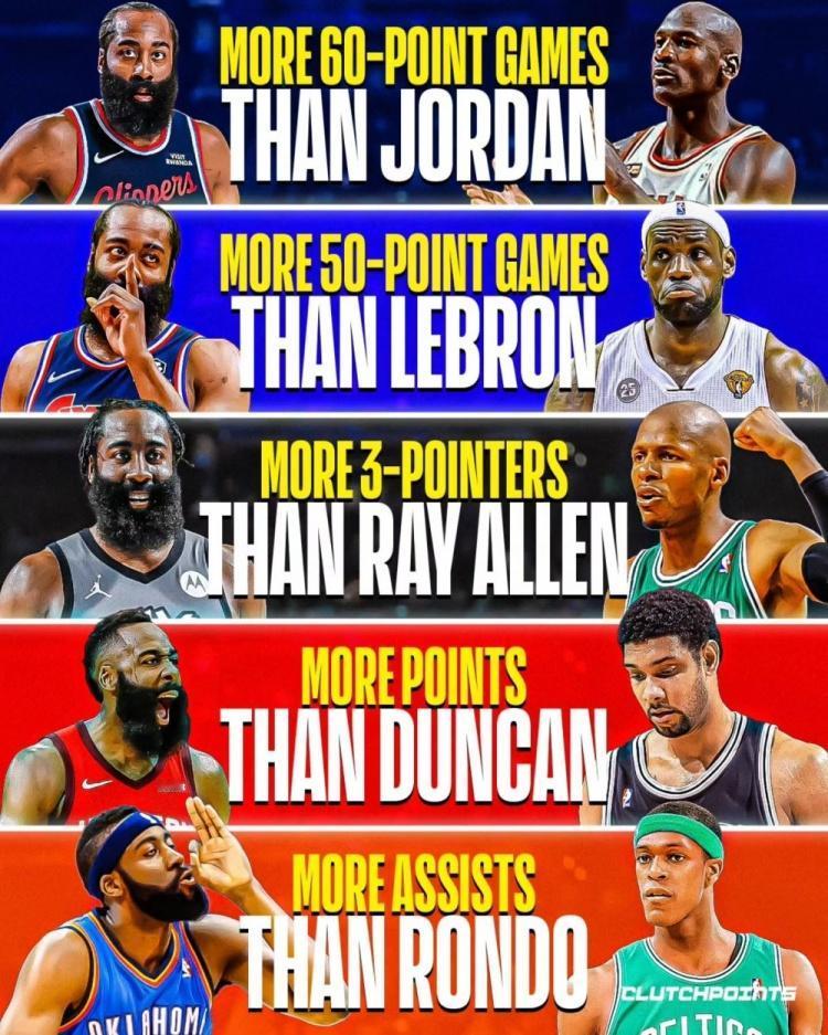全能哈登: 60+场次:哈登>乔丹 50+场次:哈登>詹姆斯 三分命中数:哈登>雷·阿伦 总得分:哈登>邓肯 总助攻:哈登>隆多 哈登生涯至今,拿到了28780分和8665个助攻,并投进了3306个三分球,这三项都在哈登之前的只有詹姆斯一人。 而在后卫位置上,哈登就是历史第一档的“双能卫”,能兼顾得分和助攻,也拿过得分王和助攻王,可以说球队需要他干嘛他就干嘛。。 现在的大荣誉里,哈登只差一个总冠军了,遗憾当然也很美,但要是能在生涯末期拿到这项荣誉,哈登的生涯就更具有传奇色彩了。