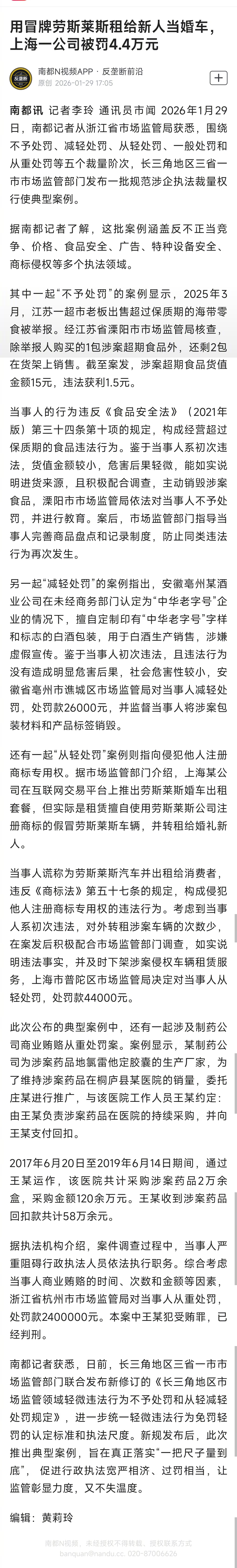 #租赁公司租假劳斯莱斯被罚4.4万#【用冒牌劳斯莱斯租给新人当婚车,上海一公司被罚4.4万元】据市场监管部门介绍,上海某公司在互联网交易平台上推出劳斯莱斯婚车出租套餐,但实际是租赁擅自使用劳斯莱斯公司注册商标的假冒劳斯莱斯车辆,并转租给婚礼新人。当事人谎称为劳斯莱斯汽车并出租给消费者,违反《商标法》第五十七条的规定,构成侵犯他人注册商标专用权的违法行为。考虑到当事人系初次违法,对外转租涉案车辆的次数少,在案发后积极配合市场监管部门调查,如实说明违法事实,并及时下架涉案侵权车辆租赁服务,上海市普陀区市场监管局决定对当事人从轻处罚,处罚款44000元。网页链接