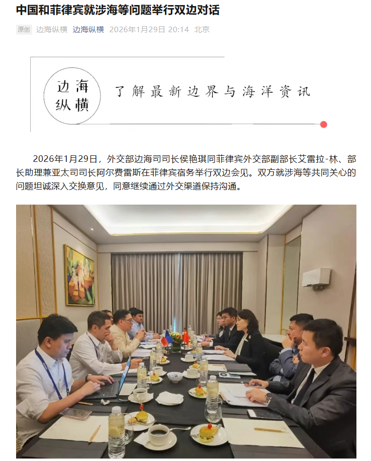 【#中国和菲律宾就涉海等问题举行双边对话#】2026年1月29日,外交部边海司司长侯艳琪同菲律宾外交部副部长艾雷拉-林、部长助理兼亚太司司长阿尔费雷斯在菲律宾宿务举行双边会见。双方就涉海等共同关心的问题坦诚深入交换意见,同意继续通过外交渠道保持沟通。(新华社)