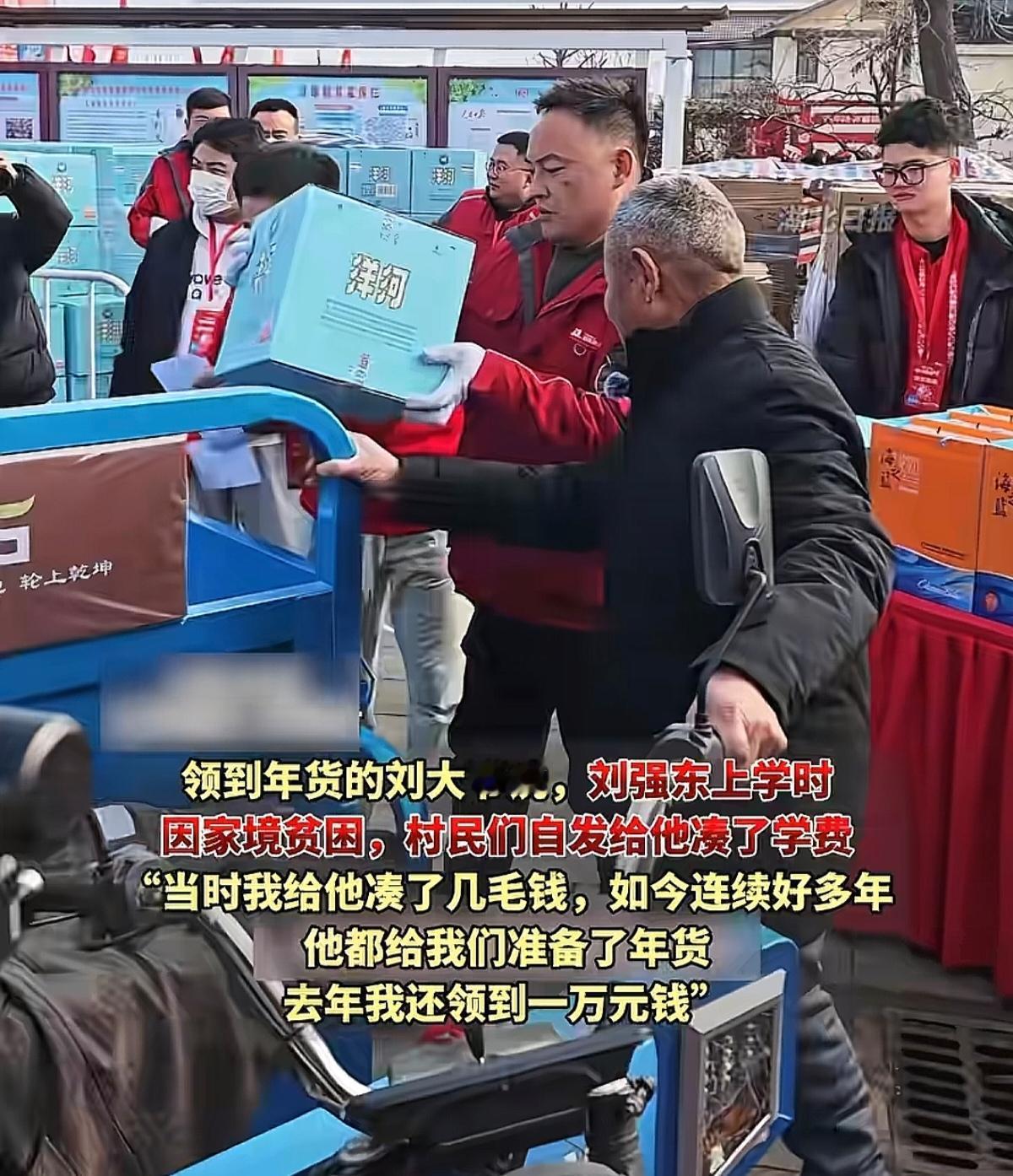 点滴善举,能托举起一个人的未来,更能沉淀出一生的感恩。光明村的刘大爷蹬着三轮车,车斗里装着满满当当的年货,脸上挂着真切的笑意。这年货是刘强东为家乡村民准备的,刘大爷的手里,攥着的不只是年货,还有一段跨越数十年的温情往事。 刘强东年少时家境贫寒,18岁奔赴大学的路费学费,都是家乡父老凑出来的。村民们彼时的日子都不宽裕,兜里的钱掰着花,桌上的粮省着吃,可面对要去求学的孩子,没人藏着掖着。刘大爷拿出了几毛钱,那几毛钱在当时,是从生活里挤出来的心意;众多乡亲你一分我一毛,凑出了500元现金,还有76个茶叶蛋。那个年代的茶叶蛋,金贵得很,不是日常能吃到的东西,要么留到过年过节,要么留给孕妇、奶娃、病人,多余的还要换钱贴补家用,76个茶叶蛋,是乡亲们把最珍贵的东西都捧了出来。 刘大爷记着当年的凑钱事,也记着这些年的回馈。去年他领到了一万元钱,今年又抱回了满满一车年货,嘴里念叨着感谢大强子,眉眼间都是藏不住的欢喜。刘强东也从未忘记这份恩情,他在微博里写下自己的心声,18岁那年的76个茶叶蛋和500元现金,是他走向世界的底气。他拼命为老家拉投资、捐款捐物,把父老乡亲的恩情,融进了年复一年的实际行动里,融进了对家乡的惦念里。 当年的几毛钱,在凑起的500元里,分量一点不轻;当年的76个茶叶蛋,在少年的心里,温暖从未消散。有人出差时一次只带10个茶叶蛋,两天内吃完,这细微的举动更能看出,那76个茶叶蛋在当年是何等珍贵的馈赠。这份双向的奔赴,是朴素的善意,是真诚的感恩,是人与人之间最动人的联结。 善念不分大小,感恩不分早晚。乡亲们以微薄之力托举少年前路,少年以满腔赤诚回馈故土乡情,这份情,在时光里沉淀,在岁月里生辉。世间最珍贵的,莫过于此,你予我滴水之恩,我以涌泉相报,一份善意,能温暖一辈子,能传承一辈辈。