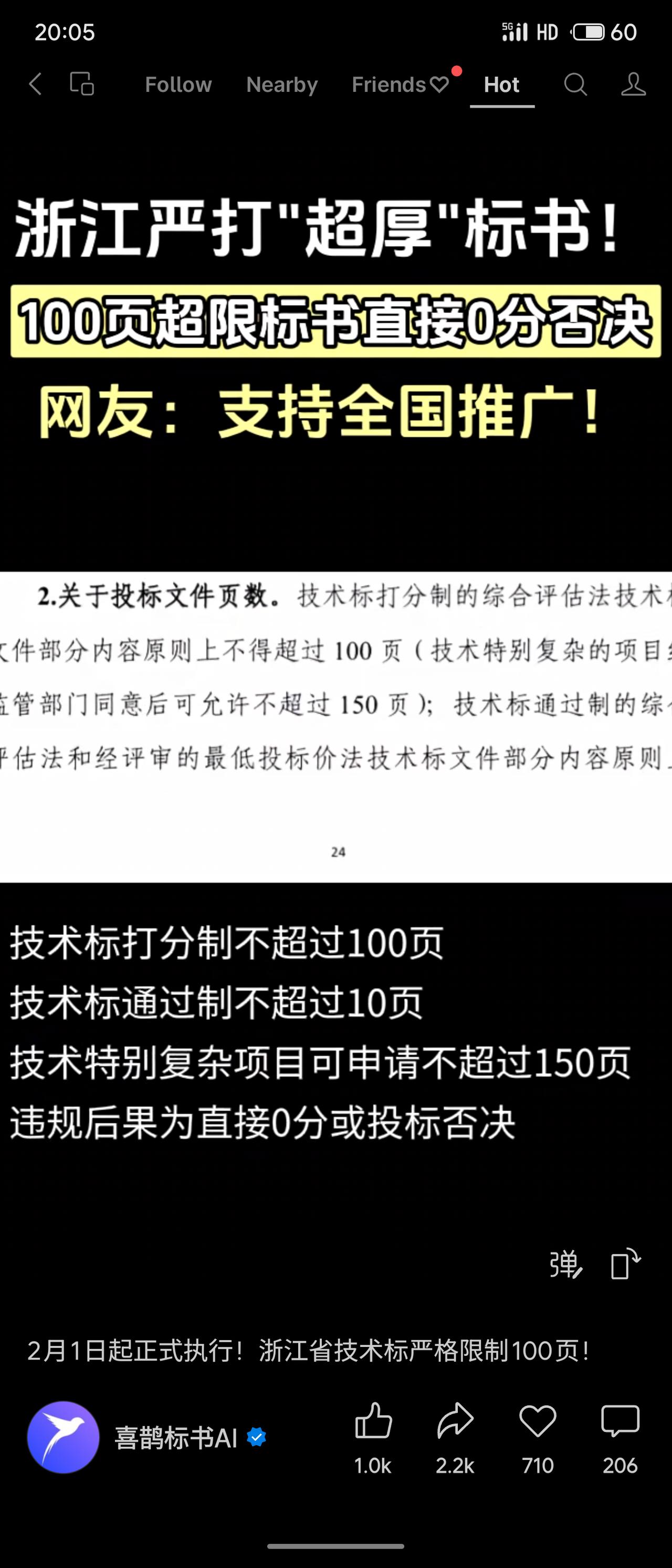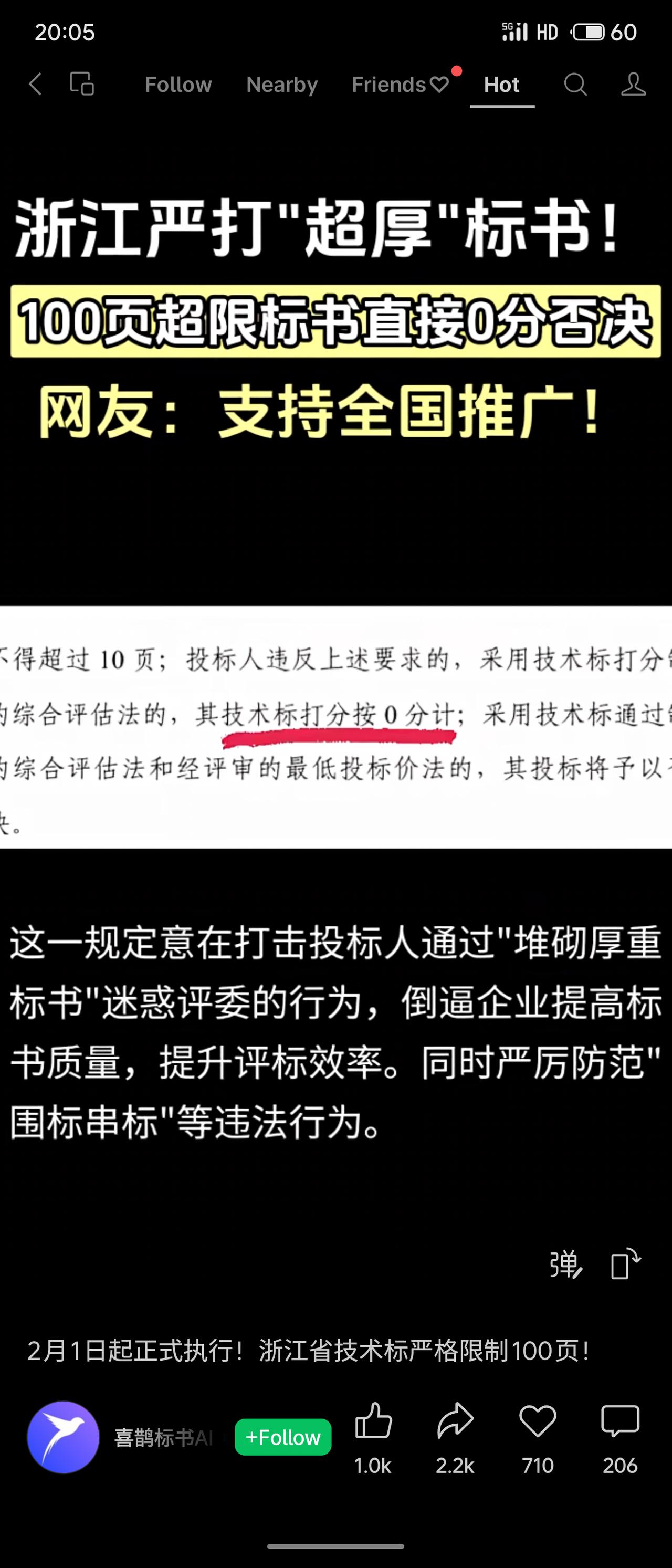 浙江省出台新规,严控投标文件页数,技术标原则上不得超过100页,超限直接0分或否决。此举旨在打击标书“注水”行为,提升评标效率与公平性,获得舆论支持,被视为优化营商环境的重要举措。