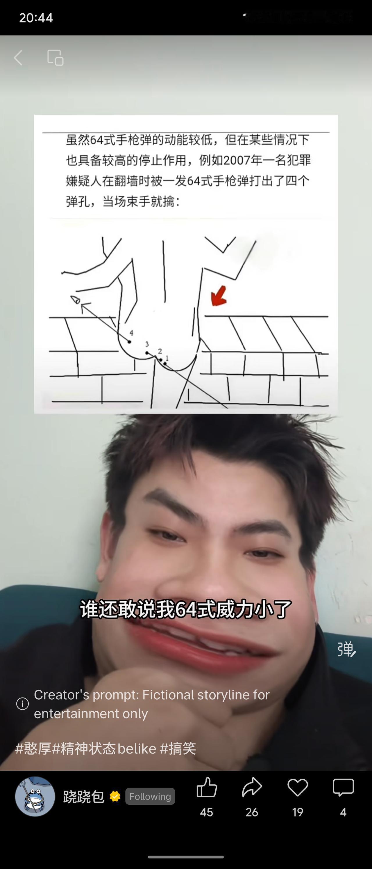 一则关于64式手枪弹威力的网络段子。内容称其虽动能低,但引用2007年个案称有较强“停止作用”,并带有娱乐创作的提示。