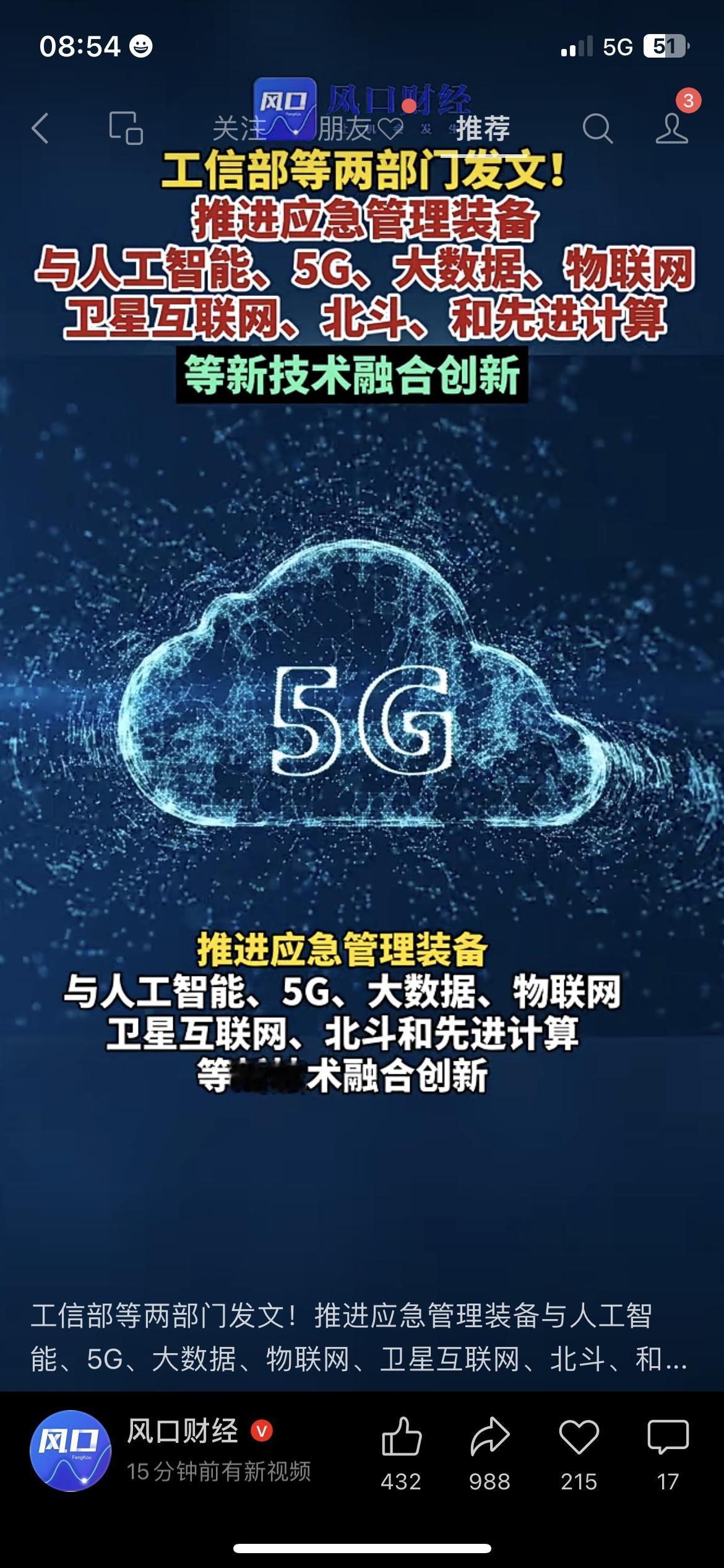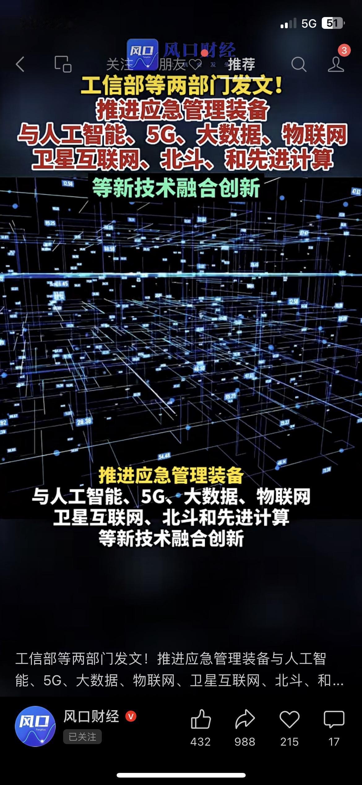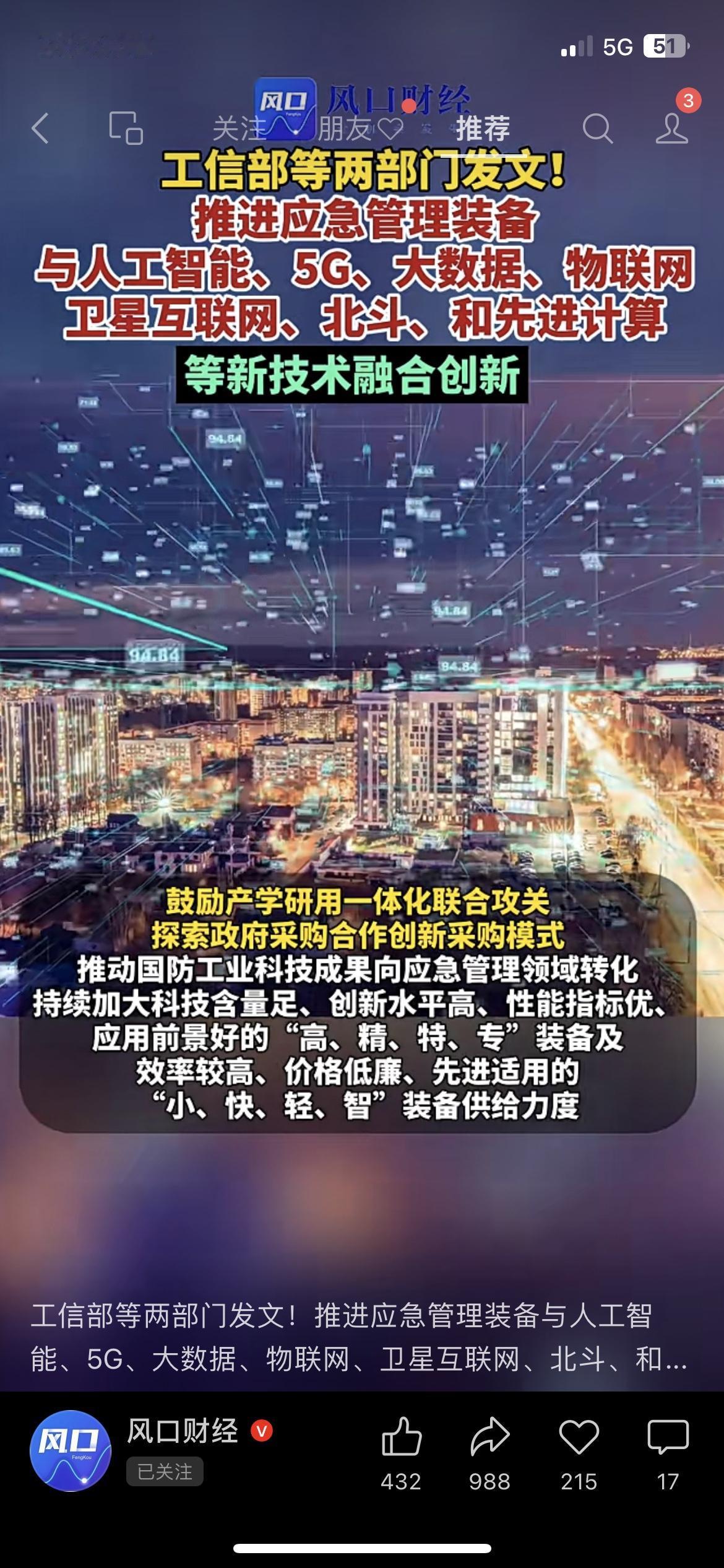 工信部放大招!应急装备要装“科技buff”了! 刚看到消息,工信部等两部门发文,要把应急管理装备和人工智能、5G、北斗这些新技术深度绑定。以后救灾现场,无人机、智能监测设备会越来越多,咱们普通人遇到险情时,救援速度和精准度都会大提升。 你觉得这波政策会带动哪些行业机会? 应急管理 科技政策