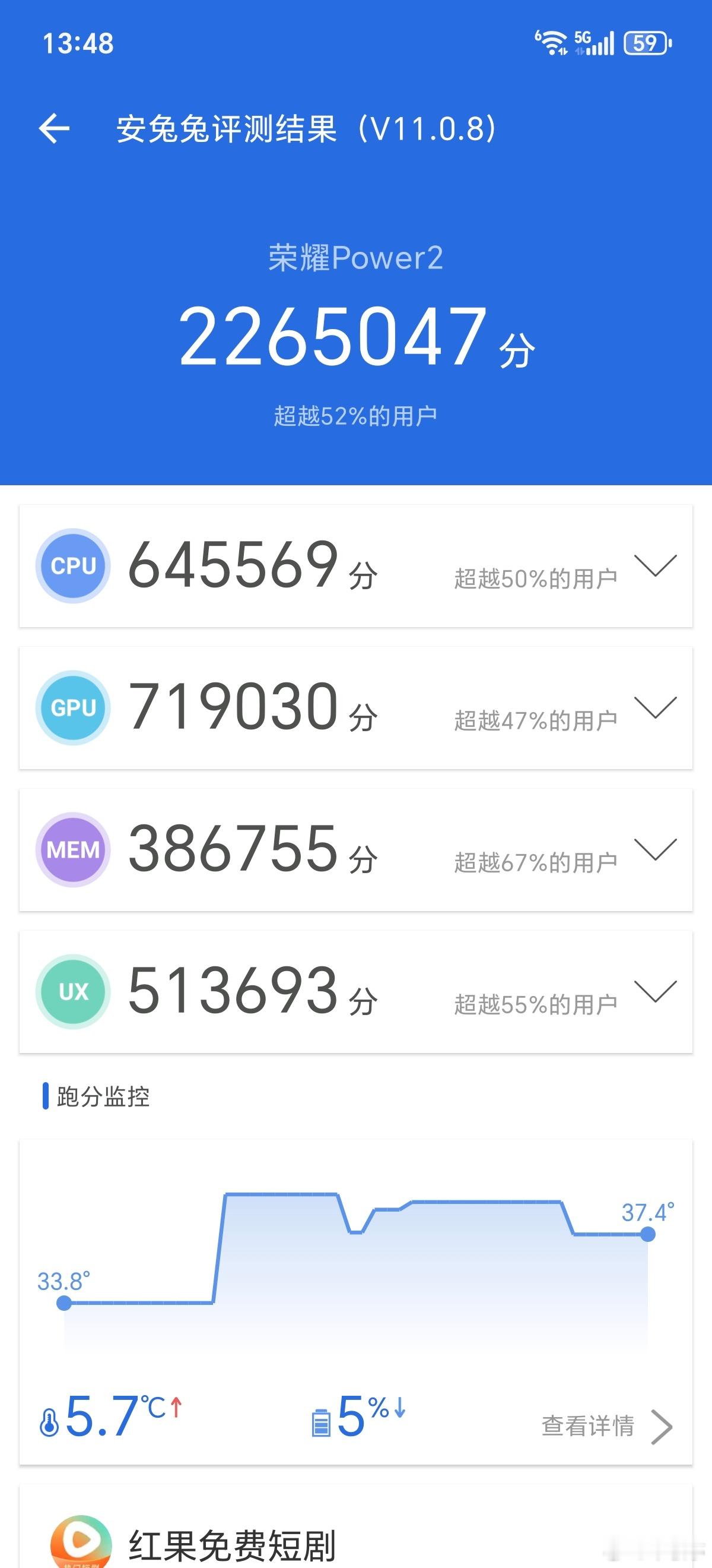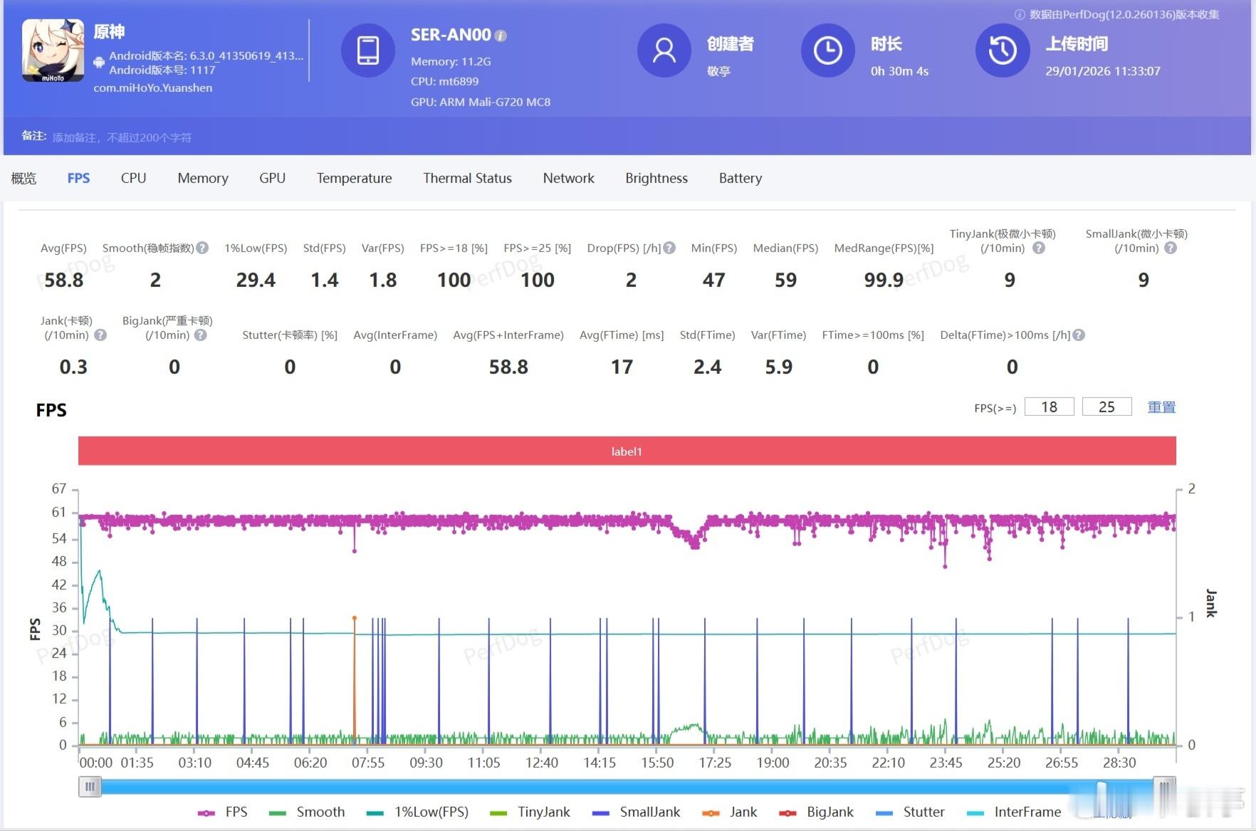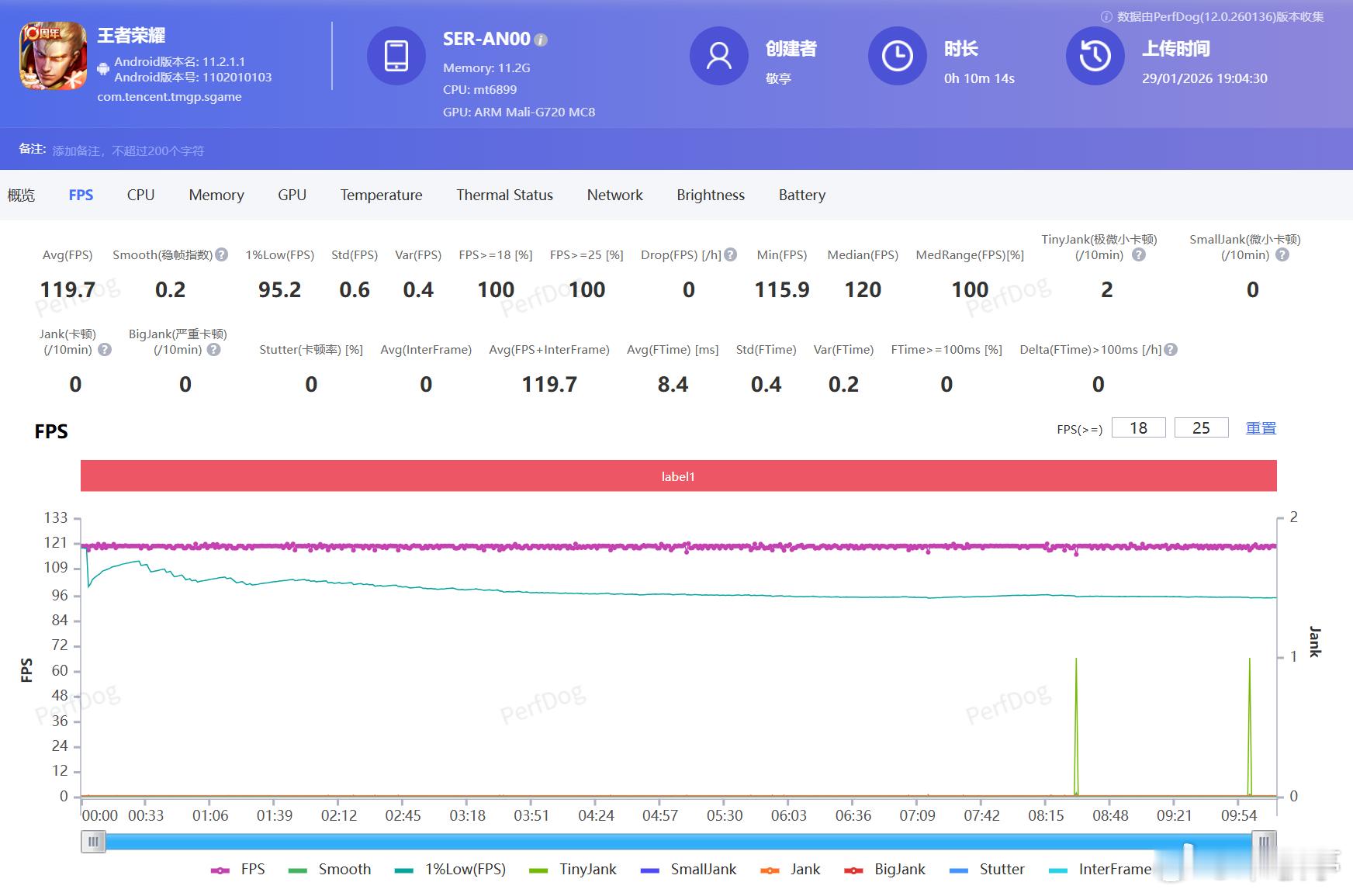 荣耀Power2作为轻户外手机,除了长续航、抗摔耐造、优秀的信号表现,这次首发的天玑8500 Elite芯片表现也是档位领先,实测安兔兔跑分226万+,游戏表现方面用Perfdog实测了一下:一局《王者荣耀》开启极高帧率、超高分辨率,平均帧率119.7帧,基本就是一条直线。《原神》60帧+极高画质,平均帧率58.8帧,虽然比起最新旗舰机略低一些,但放在同档位也是非常优秀的,作为户外定位大家对这性能表现满意吗?