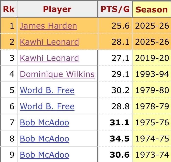 据统计,科怀·伦纳德(28.1)和詹姆斯·哈登(25.6)有望成为快船队历史上第