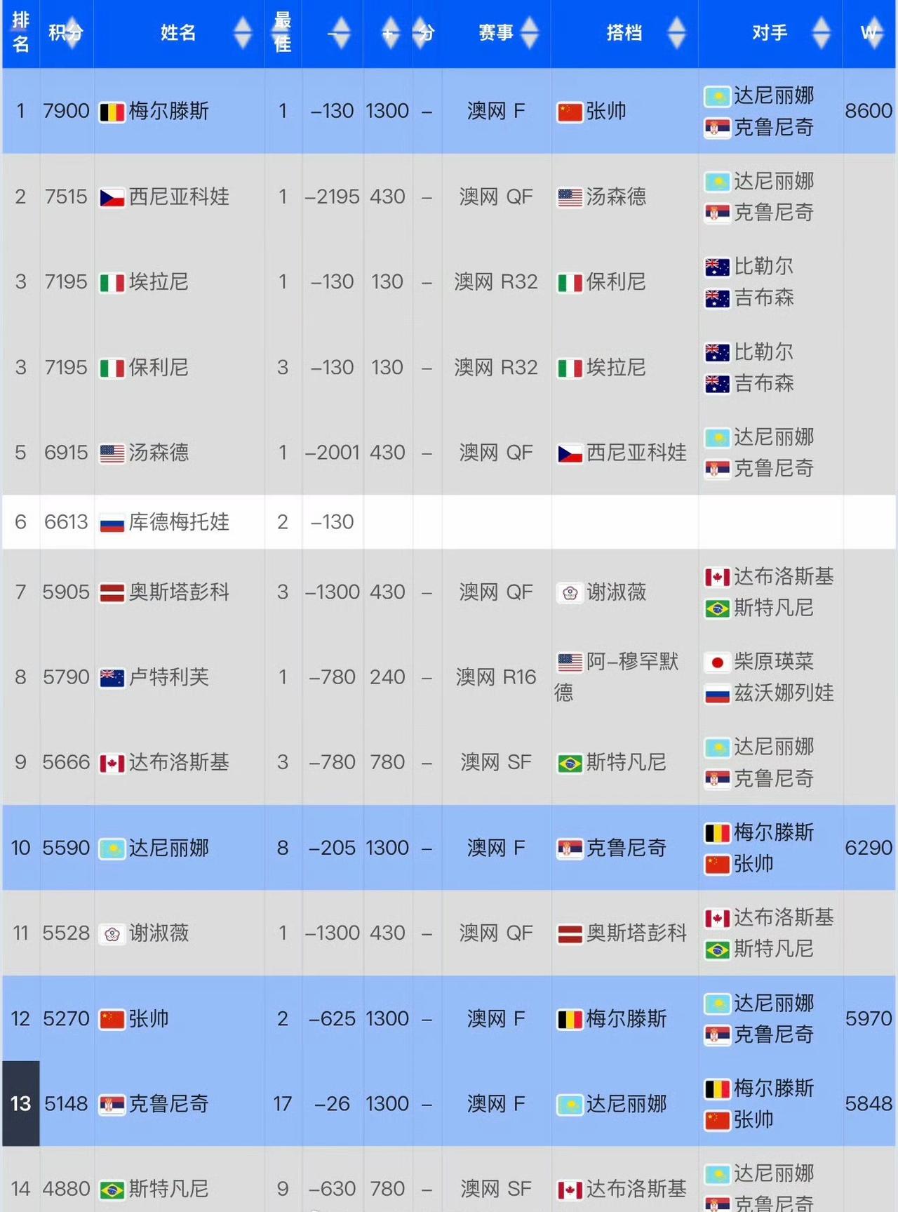 女子网球有多卷!女单第6名的佩古拉都6000多分了,而女双5000分更是只能排名第14位。 莱巴金娜击败大富升至世界第3,排名反超阿尼西莫娃、高芙。郑钦文早已不在这份榜单上。 现在女网比男网好看,男网除了双子星没几个能突围的,女网应证了赛妈的那句话。