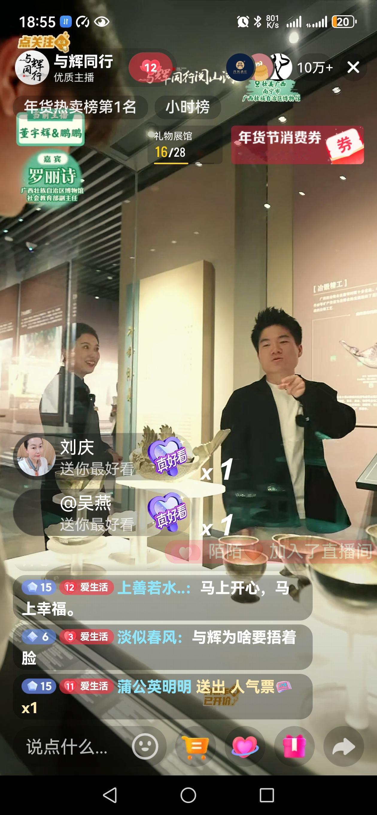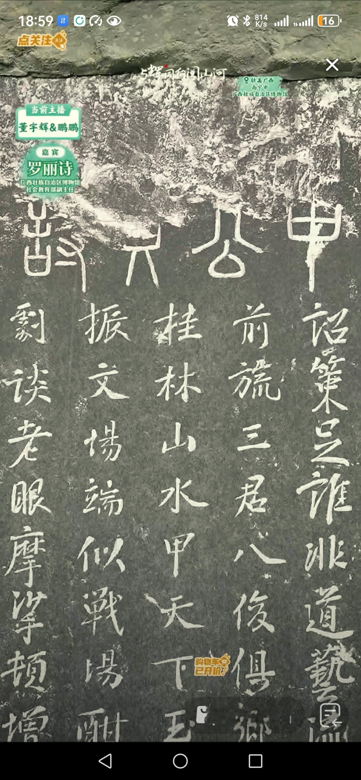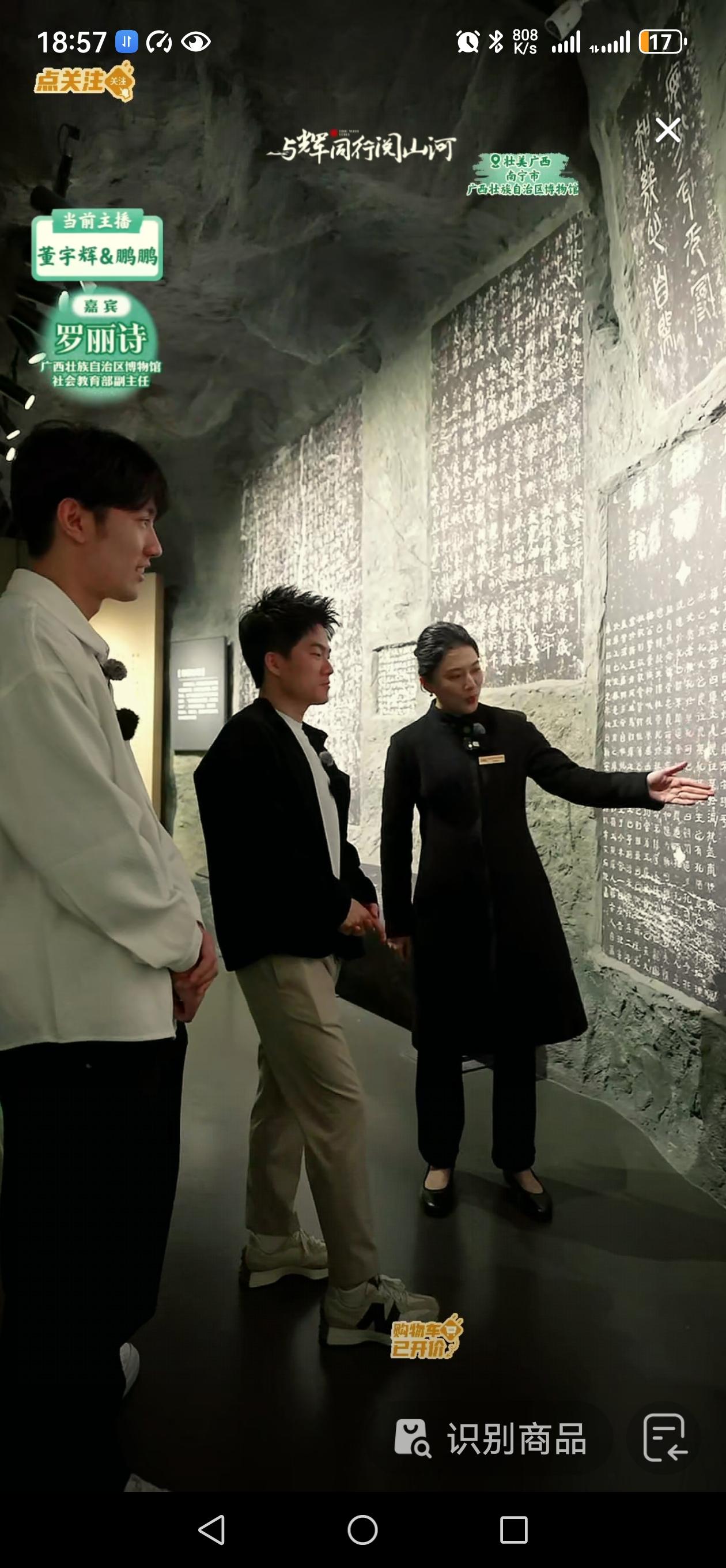 与辉同行阅山河第2天,首府南宁主场,青秀山,展示了广西良好的绿色生态和多姿多彩的植物资源,区博物馆,广西几十万年以来的历史在这里陈列。 此时阅山河广西三城中,最郁闷的估计是桂林了,桂林山水甲天下,却无缘在这盛大的文旅活动中得到展现。历史上桂林作为广西的历史文化名城和省府,留下了无数经典的人文景观。比如四大水利工程灵渠,唯一存世的北宋元佑党籍碑,徐霞客记录过的奇山秀水…连昨晚的小吃街里都没有一样桂林的小吃,作为广西米粉代表的是螺蛳粉,董宇辉当年来桂林,至今没有吃到那一碗最正宗的桂林米粉。 在博物馆里,终于看到了桂林相关的存在,解说员说,唐碑看西安,宋碑看桂林,在这幅桂林山水甲天下的碑刻前,讲解员考了董宇辉一个难题,他问桂林山水甲天下的下一句是什么,答案并不是常见的阳朔山水甲桂林,而是诗人王正功的下联,“玉碧罗青意可参。” 此刻直播间里安安正在卖桂林三花酒,中国米香型酒的唯一代表,论酒,也是桂林第一啊!