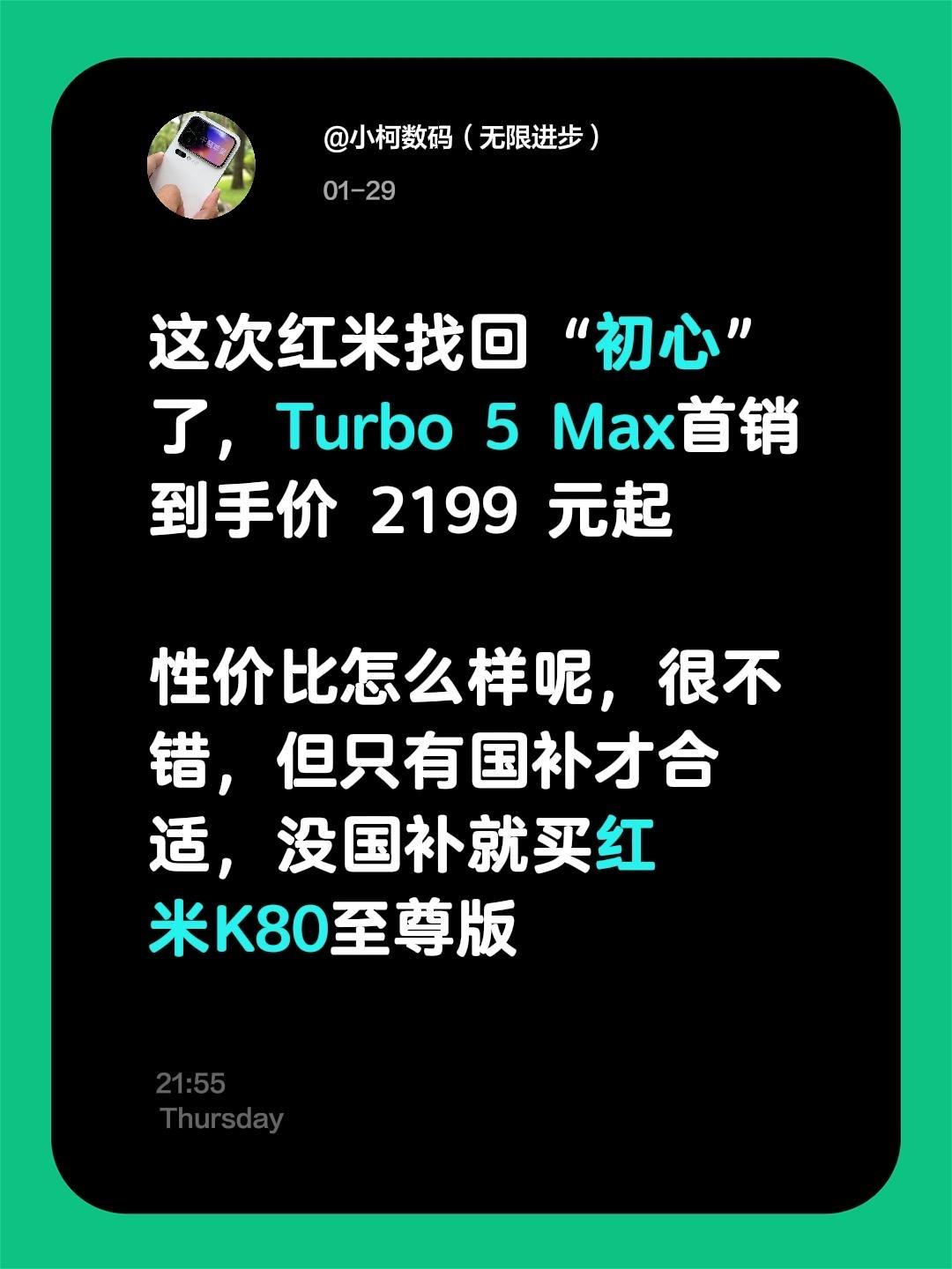 这次红米找回“初心”了,Turbo 5 Max首销到手价 2199 元起 性价比怎么样呢,很不错,但只有国补才合适,没国补就买红米K80至尊版买不买求支招 让我看看你有什么好东西 这个东西不白买