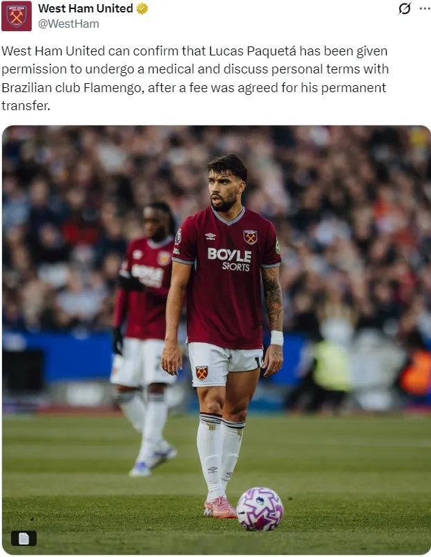 官方:西汉姆宣布和盟弗拉门戈就帕奎塔的转会费达成了协议,这名中场已经被允许参加体检并讨论个人待遇。据悉帕奎塔的转会费为4200万欧元,巴西人将和弗拉门戈签下一份5年合同。