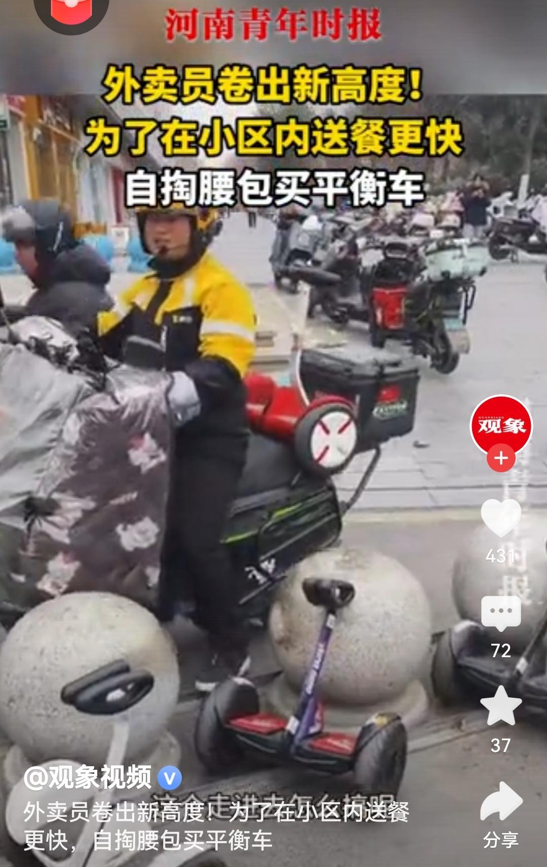 外卖员为了送餐更快自掏腰包买平衡车这位外卖员太拼了!自掏腰包买平衡车只为更快送餐,这份为了生活全力奔跑的韧劲让人敬佩,平凡岗位上的努力最动人,愿他的每份付出都能被温柔以待。[烟花][烟花][烟花] 外卖小哥电动车 评论打卡任务