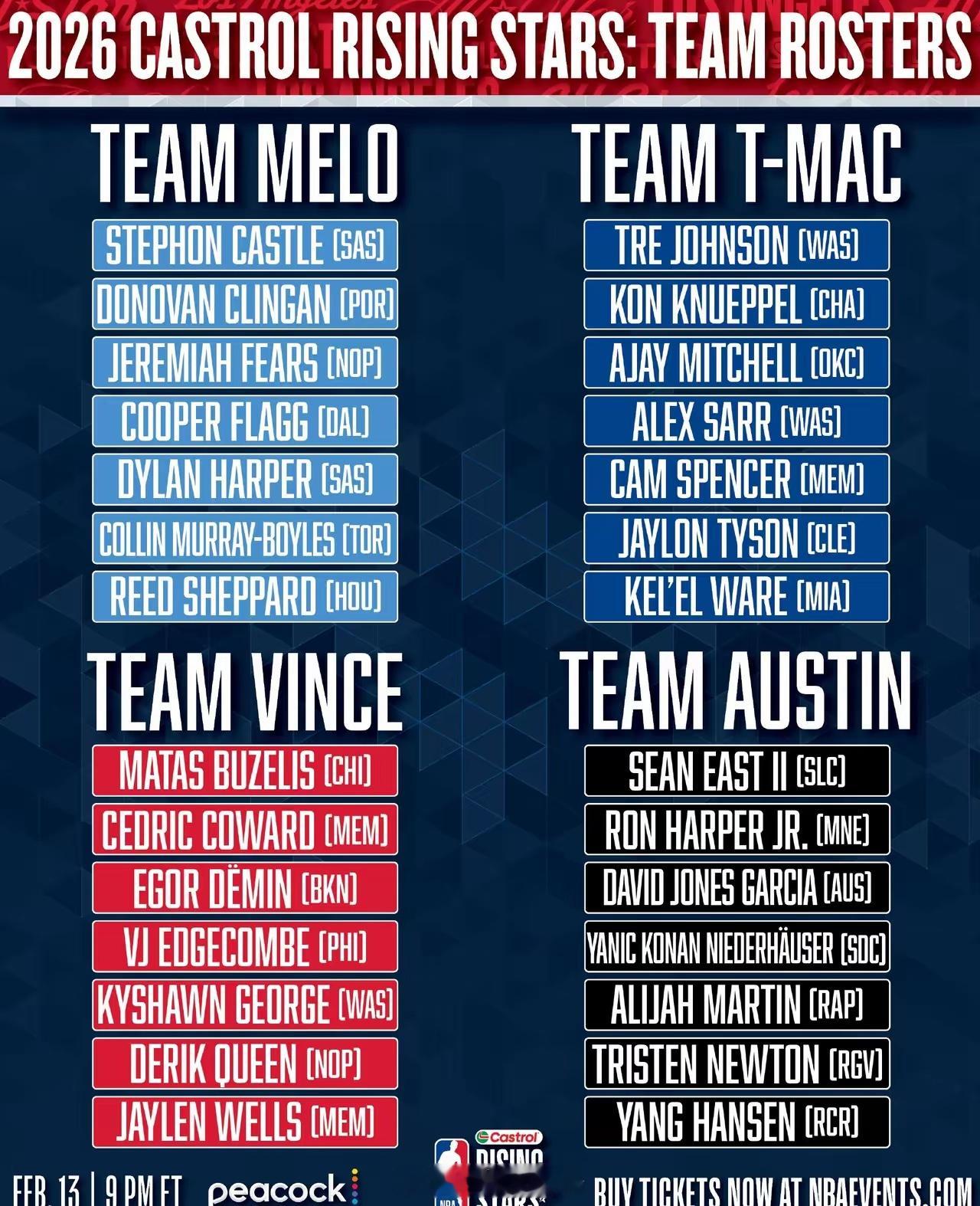 艾弗森杨瀚森以G联赛球员身份入选了全明星新秀赛,在分队环节入选奥斯汀-里弗斯