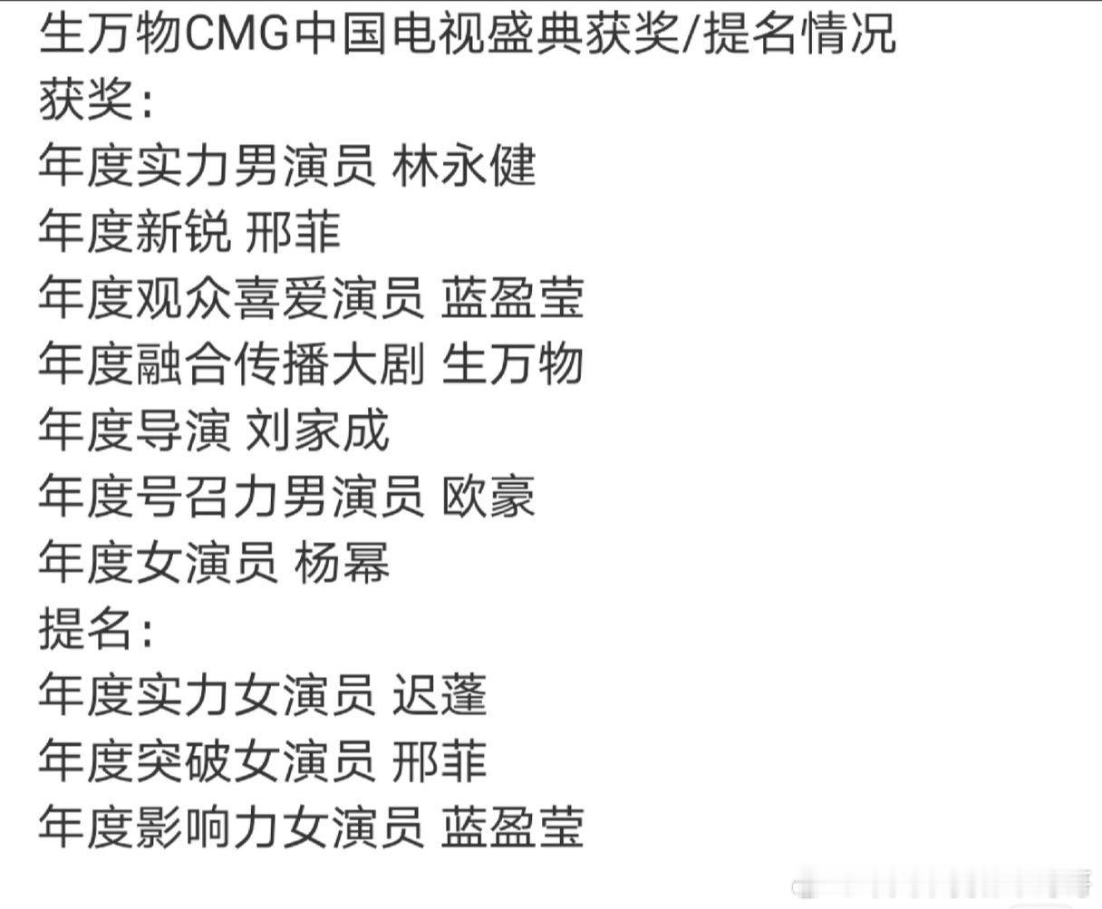 恭喜《生万物》,横扫!当一部剧很多人都获奖了,含金量毋庸置疑 杨幂总台视后