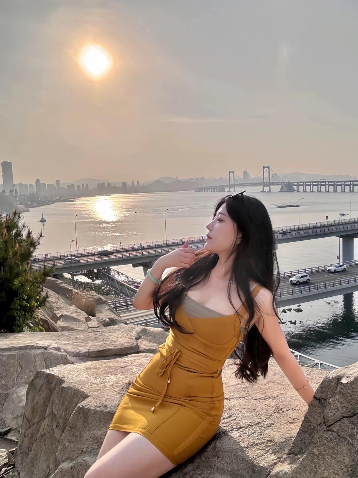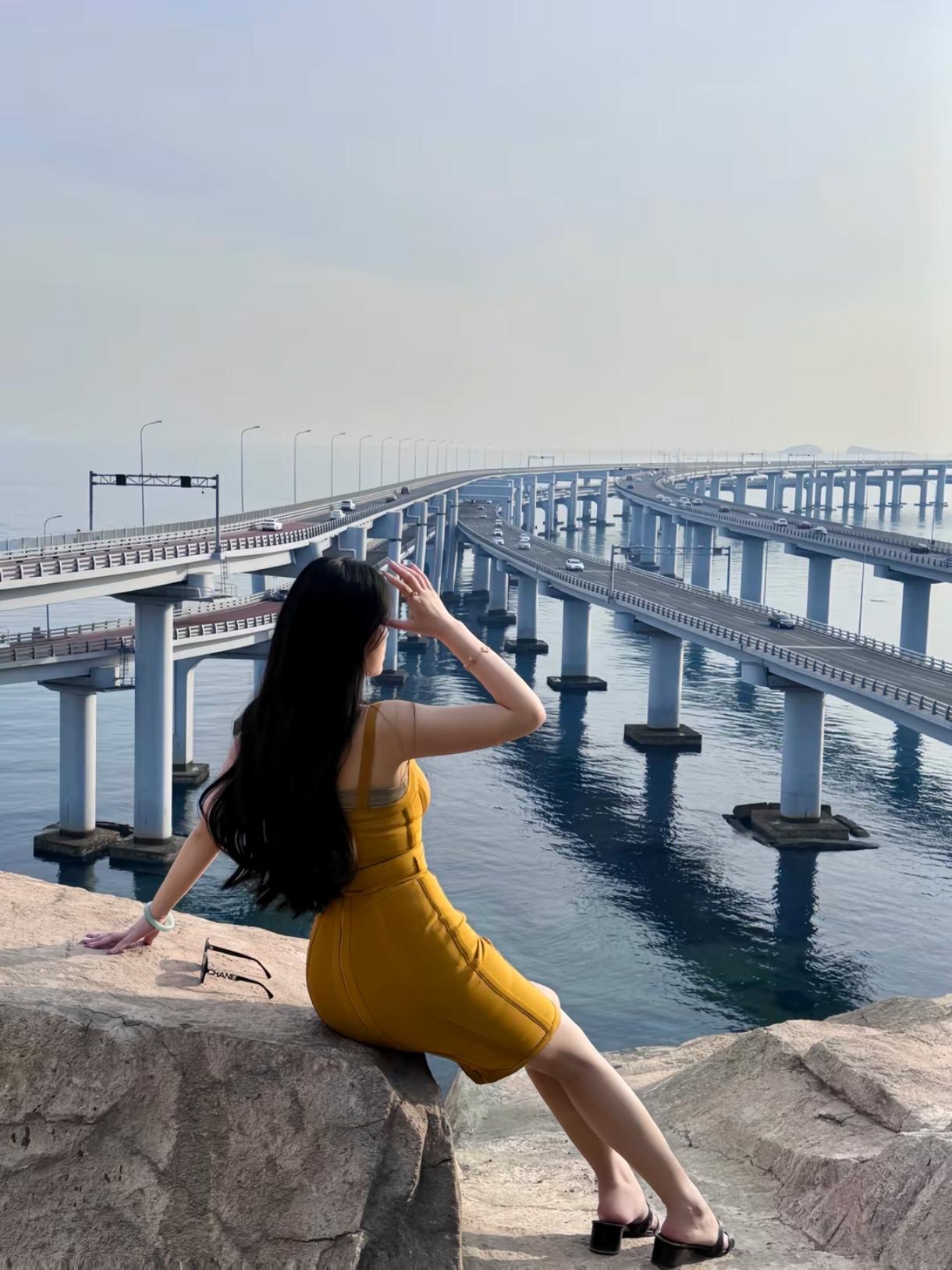礁石上的黄裙 阳光把海面熨成半透明的蓝 长桥像被风吹弯的银链,在浪上延伸 车影是链上细碎的光,奔向远处的岸 我坐在被晒暖的礁石上 黄裙铺开一小块明亮,和落日撞个满怀 长发被风揉乱,就由着它缠上耳后的风 浪拍着桥墩,发出闷响 像谁藏在心底的心跳 我试着把影子按进石缝里 让潮声替我说出没讲完的话 远处的楼群在雾里模糊成淡墨 归鸟擦着桥顶飞,翅膀驮着细碎的金 我忽然开始等—— 等某个并肩的人,带着半罐橘子汽水 坐下来,和我一起看 看潮水漫过脚踝,看落日把我们的影子 在礁石上,叠成同一片暖黄