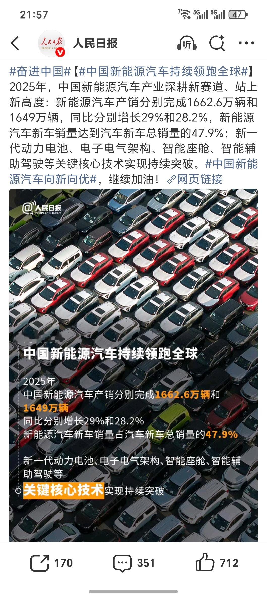 中国新能源汽车持续领跑全球25年国产新能源汽车产销突破1600万连续11年蝉联全球第一国内市场渗透率逼近50%明年各品牌的出海也会持续上涨国产新能源领跑全球已是事实!