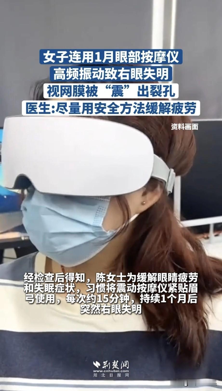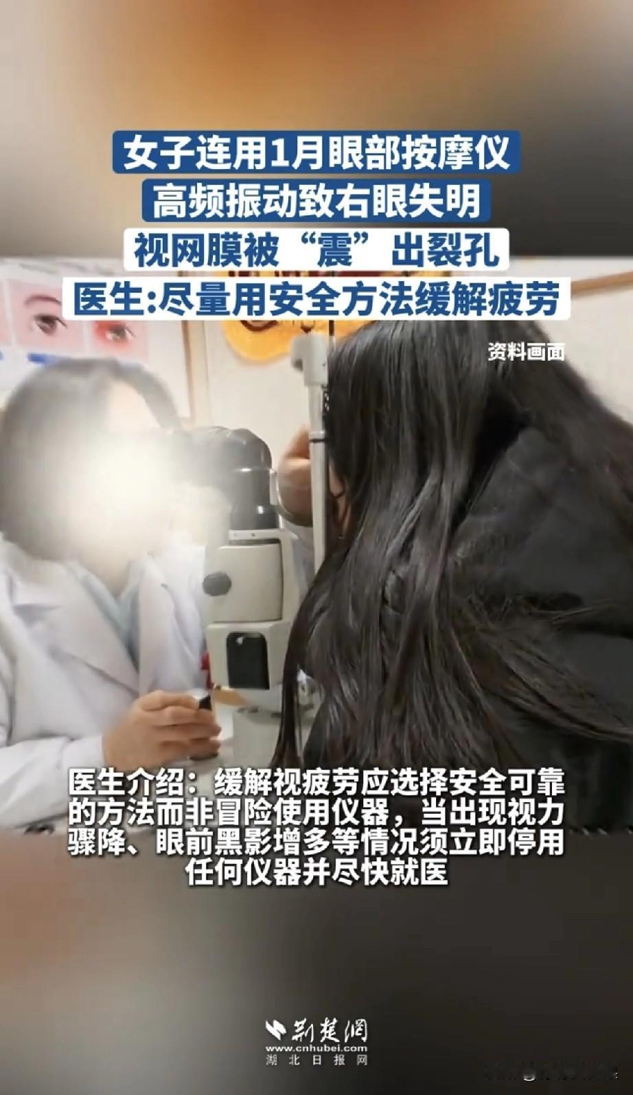 家人们,刷到陈女士这事我真的惊了,本想护个眼,结果差点把眼睛搞废,这到底是咋回事? 陈女士平时总觉得眼睛酸,就买了个眼部按摩仪,天天睡前按15分钟,这一坚持就是整一个月。结果某天早上醒过来,右眼模模糊糊啥也看不清,她一开始还寻思是刚睡醒没缓过来,没当回事,谁知道没一会儿,右眼直接彻底看不见了!这才慌了神,赶紧往医院跑。 一检查医生的话直接让她懵了:右眼视网膜被按摩仪的高频震动震出个裂孔,还脱开了,眼球也挫伤了!罪魁祸首就是那台她天天用的护眼仪,谁能想到想护个眼,反倒把眼睛伤成这样。 还好送医及时,医生立马给做了视网膜复位的手术,总算是把眼球保住了。但咱说实话,这后遗症一点不小:视网膜伤了之后,感光的细胞坏了就恢复不了,她的视力再也回不到以前的样子了,而且往后还得一直复查,生怕视网膜再脱开,这辈子眼睛都得小心伺候着。 就这么一个看似平常的养生小习惯,换来一辈子的视力损伤,这教训真的太惨痛了! 咱养生的初衷不就是为了身体好吗?结果盲目跟风,反倒伤了自己,真的太不值了。希望陈女士这事儿能给大伙敲个警钟,护眼别瞎折腾,踏踏实实的才是真的!