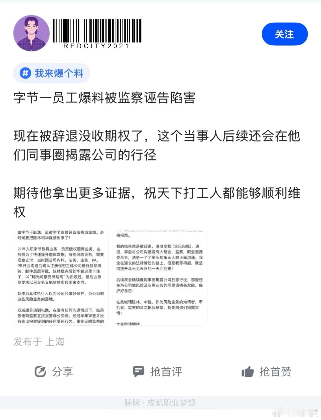 宇宙厂员工发文控诉:脏活我干,黑锅我背?有脉友在发帖自称:21年在字节教育做版权题库,因业务需要进行涉及现金周转的风险操作,按流程走邮件层层审批,最终业务让他以“采买”名义把款项周转出去。双减后转到电商,竟被监察以旧日流水直接报警“非公受贿”,审查半年没查出受贿证据,但他仍被辞退、通报、期权(含已归属)被没收,沟通无人回应,只能走法律诉讼。
