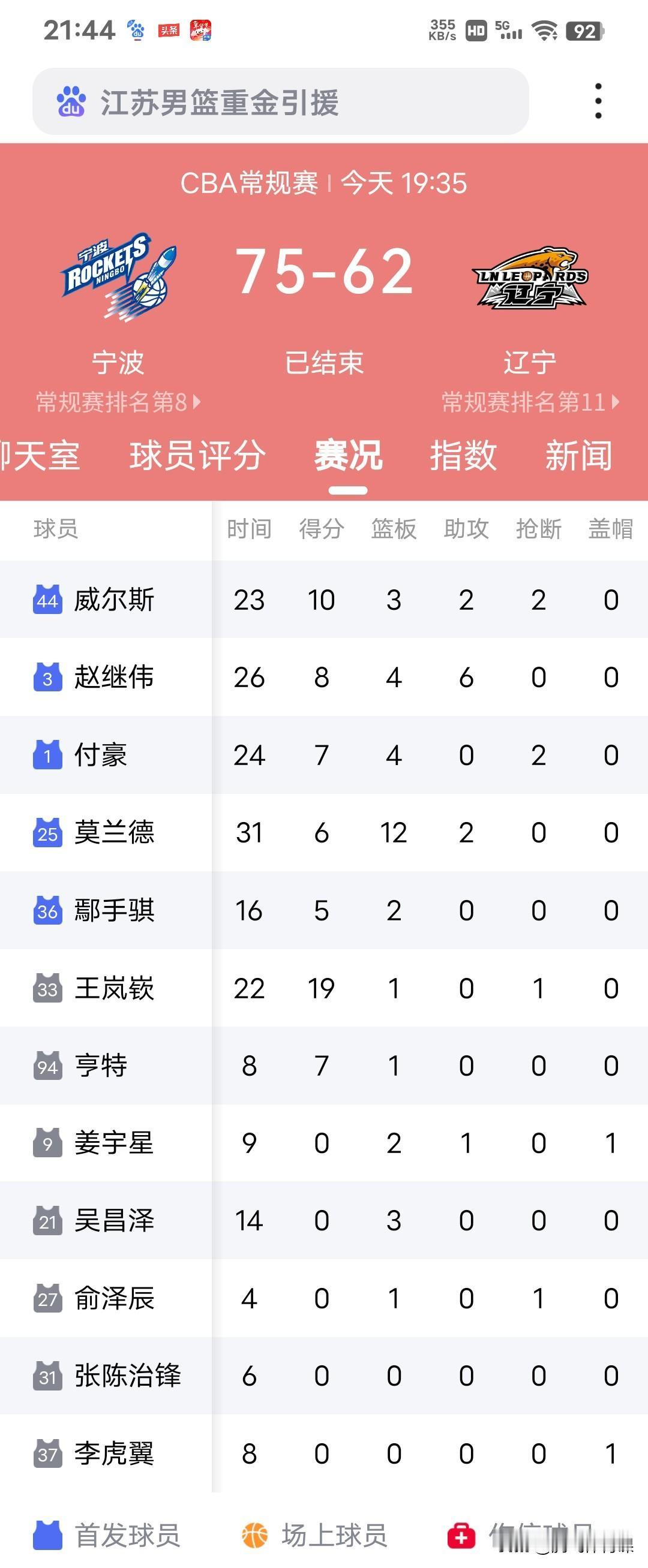 辽宁客场62:78不敌宁波,不得不承认4大事实。 1.莫兰德缺少进攻火力已不适合辽宁队,单有篮板不足以带领球队赢球本场比赛仅8投2中,三分球2投0中,仅贡献6分12篮板2次助攻, 2.指望赵继伟带领辽宁队冲击季后赛难度非常大,缺少像郭艾伦这样牵制力搭档,赵继伟威力减弱了不少,本场比赛14投仅3中,其中三分球8投1中,仅贡献8分4篮板6次助攻,一旦被对方针对性重点防守,投篮命中率下降非常严重。 3.亨特的个人能力相比上赛季已若判两人,便宜确实真的没好货。 4.姜宇星基本失去了在吉林队的水准,严重出现水土不服,仅当成一名防守型球员使用完全体现不出自己的价值,三年大C类合同彻底打水漂。