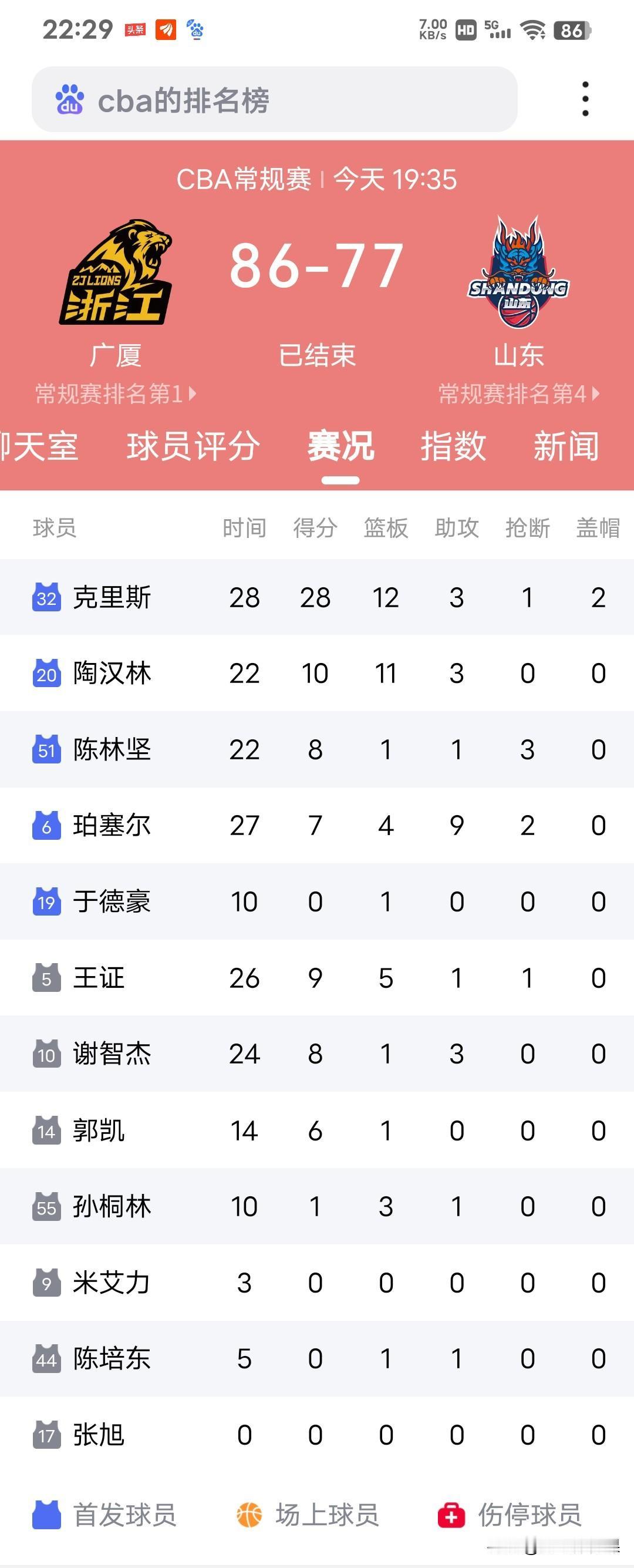 山东客场77:86不敌广厦,这三人表现仍值得肯定。 1.克里斯--全场贡献28分12篮板3次助攻1次抢断, 2.陶汉林--全场贡献10分11篮板3次助攻, 3.王证--全场贡献9分5篮板1次助攻1次抢断。 珀塞尔命中率太低,全场仅16投2中,其中三分球11投1中,完全没有手感,而陈林坚手感不错,可惜没有球权,首发出场的于德豪一分未得,陈培东,艾米力同样0分,孙桐林也仅有1分入账,高诗岩没有进入比赛大名单。