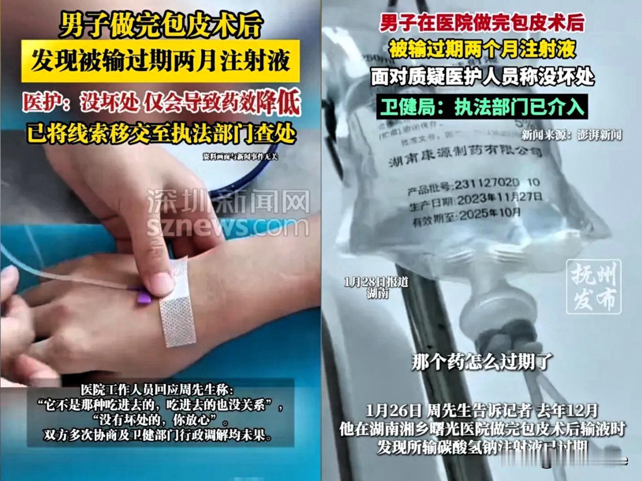 “严查到底!”2025年12月,湖南湘乡一男子在当地医院做完包皮手术后输液,无意间发现护士给自己输的碳酸氢钠注射液有效期至2025年10月,已过期两个月。医护人员却称不会致命,只是药效差些。网友质疑:打针不就是为了药效吗? 周先生术后遵医嘱在医院输液,本以为是常规护理,查看药液包装时却发现惊人问题:注射液有效期标注为“2025年10月”,而输液时间已是12月,药品过期两个月。 他当即质疑医护人员,对方却轻描淡写回应,称这是冲洗类药物,过期也没坏处,顶多药效降低,不会危害人体。这解释让周先生又惊又怒,药品过期就是不合格产品,怎会没危害?不然要保质期何用? 越想越后怕,术后本需安心恢复,却因过期注射液提心吊胆,身心皆受折磨。于是周先生将相关线索移交执法部门,相关部门已介入调查。 网友认为医护人员说法不负责任,过期药品怎能随意使用?医院不核对药品有效期,简直拿患者生命当儿戏!也有网友质疑医护人员是否习以为常,常给患者用过期药。希望相关部门严查严惩,给患者交代。 信息来源:《男子在医院做完包皮术后,被输过期两个月注射液,面对质疑医护人员称没坏处,卫健局:执法部门已介入》抚州发布