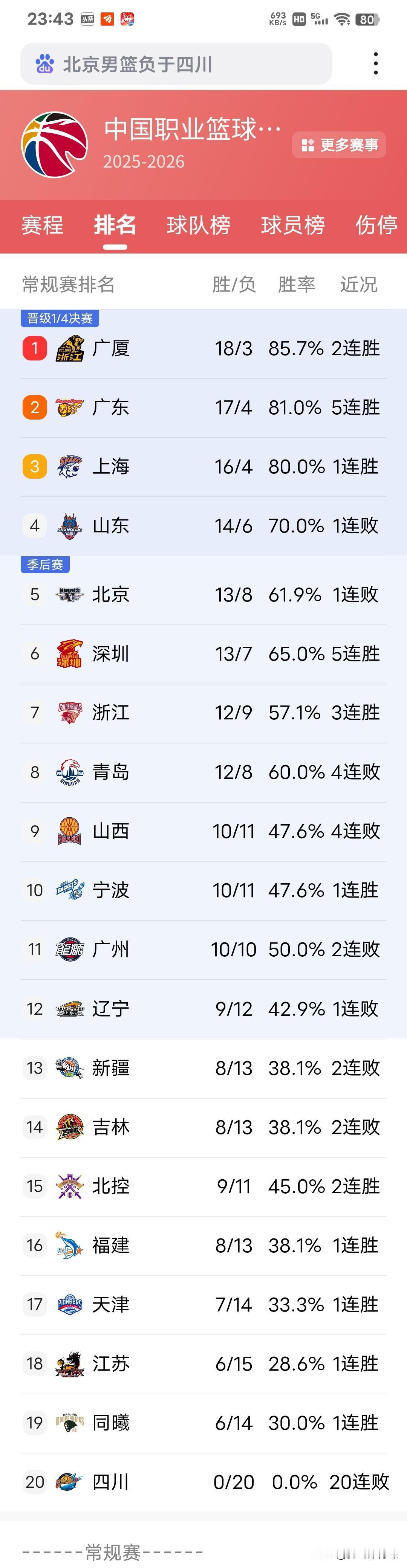 截至目前!CBA本赛季战绩倒退最严重四支球队: 1.辽宁队,上赛季排名第四,目前仅9胜12负排名第12,已是最近6个赛季最差战绩。 2.新疆队,上赛季排名第五,目前仅8胜13负排名第13, 3.山西队,上赛季常规赛亚军,目前仅10胜11负排名第九, 4.北京队,上赛季季后赛亚军,常规赛季军,目前仅13胜8负排名第五,而且周琦,曾凡博还在养伤,排名估计继续往下掉。 其中辽宁,新疆已换帅,能不能扭转局面需要在第二阶段比赛去验证,至于潘江,许利民身上压力不小,俱乐部大投资却没有收到相对应的收获。