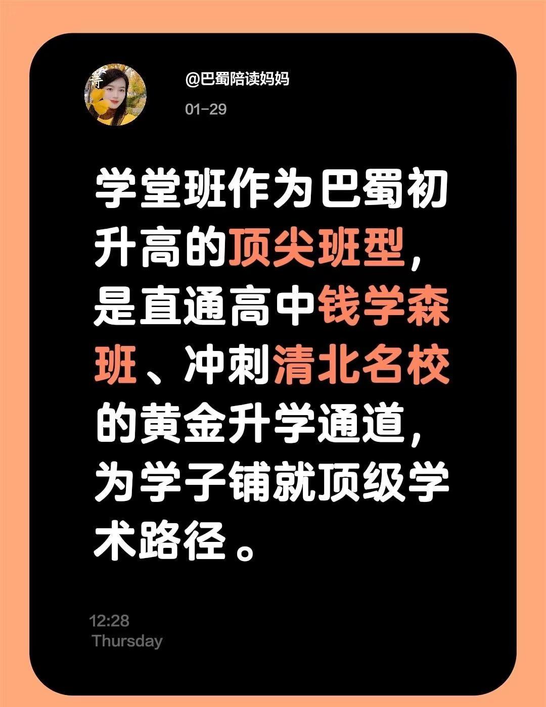 我评论了@巴蜀陪读妈妈 的作品:学堂班作为巴蜀初升高的顶尖班型,是直通高中钱学森班、冲刺清北名校的黄金升学通道,为学子铺就顶级学术路径。升学规划重庆升学 竞赛
