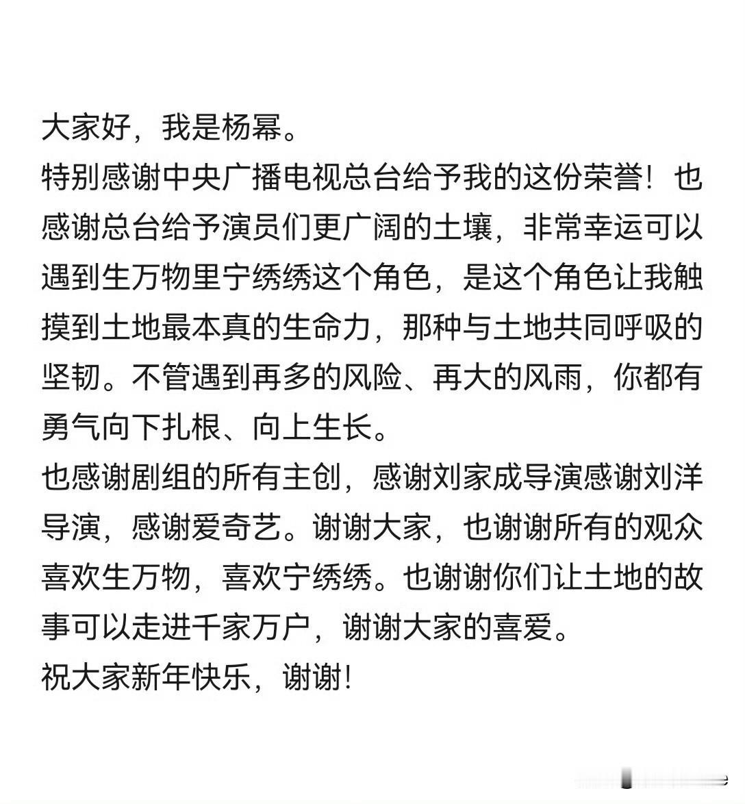 1月29日,杨幂凭借《生万物》获总台影后 上台发表获奖感言一度哽咽,黑长直尽显大气优雅,内娱不只有乌烟瘴气还有一片繁荣 通过杨幂的《生万物》告诉内娱所有创作者,好的作品是值得所有人认可的,大家应该把注意力放在作品创作与角色塑造上! 恭喜杨幂又拥有了一部代表作及人生角色得同时,也希望这类的剧越来越多,大家的剧情都能更加的接地气,更加的落地! 这里的接地气不仅仅指的是年代剧,其他古装仙侠玄幻悬疑也一样,接地气不要虚头巴脑,不要理想主义,不太过于脱离实际!