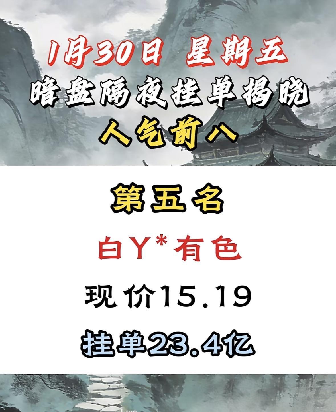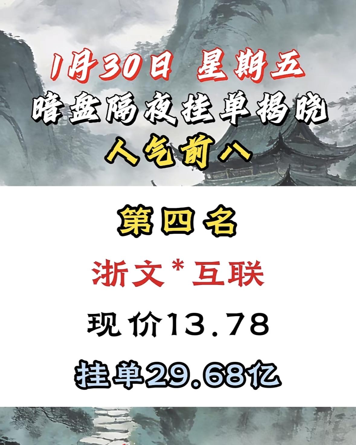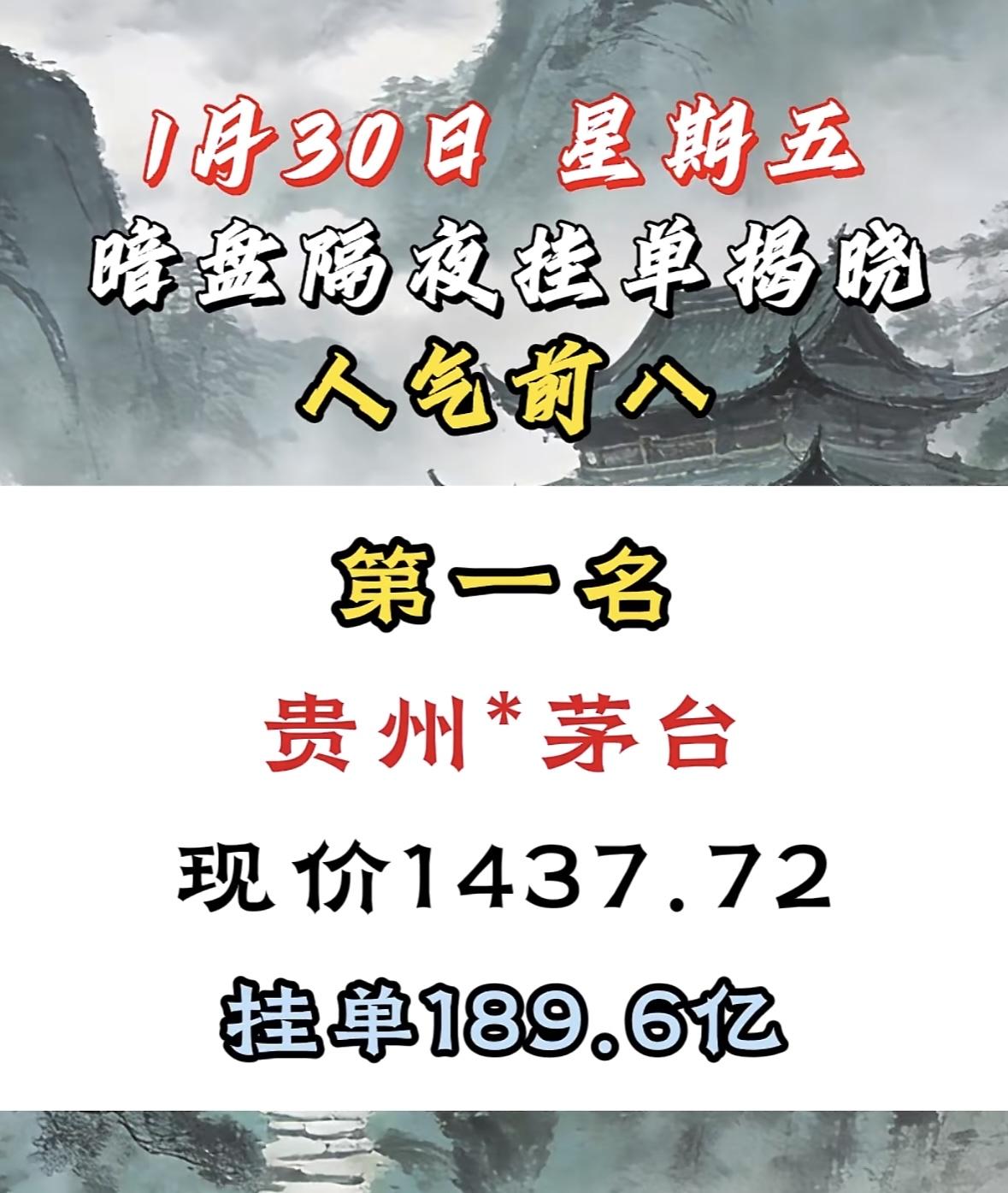 1月30日利欧股份现价9.57,挂单13.2亿,暗盘隔夜挂单揭晓! 茅台暗盘挂单夺冠,资金热捧显龙头魅力,市场人气高涨彰显价值。 "茅台暗盘登顶,人气榜首!现价千四档,挂单近两百亿,市场热度爆表。"