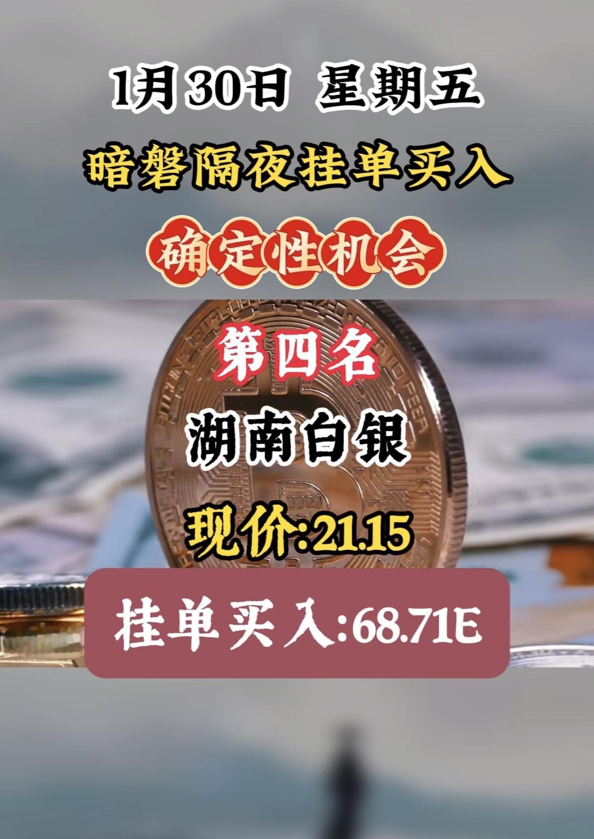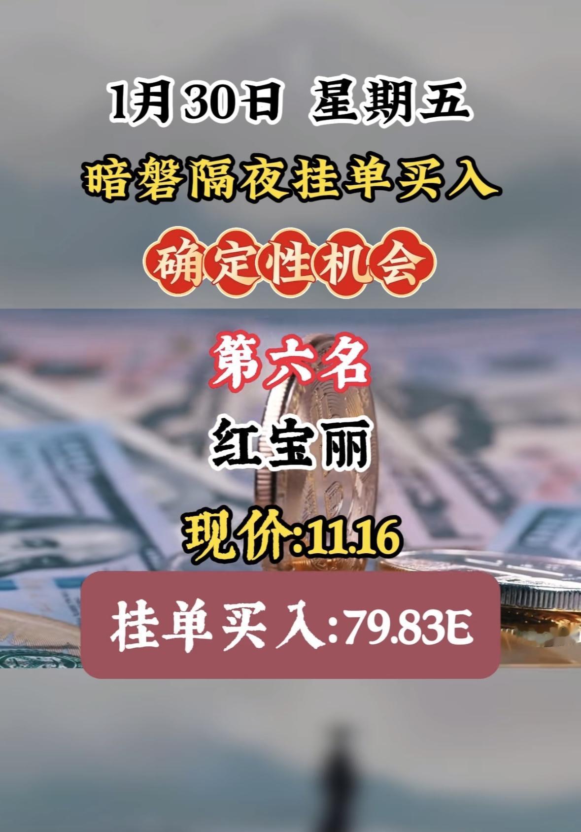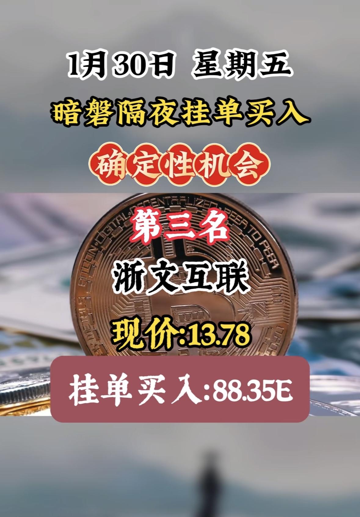 1月30日暗盘隔夜挂单买入,抓住确定性机会! "暗磐机会现!周五挂单利欧股份,现价低位待反弹,确定性买入时机别错过。" 暗磐机会来临,隔夜挂单布局优质标的,确定性策略助力捕捉潜力股,静待市场验证。