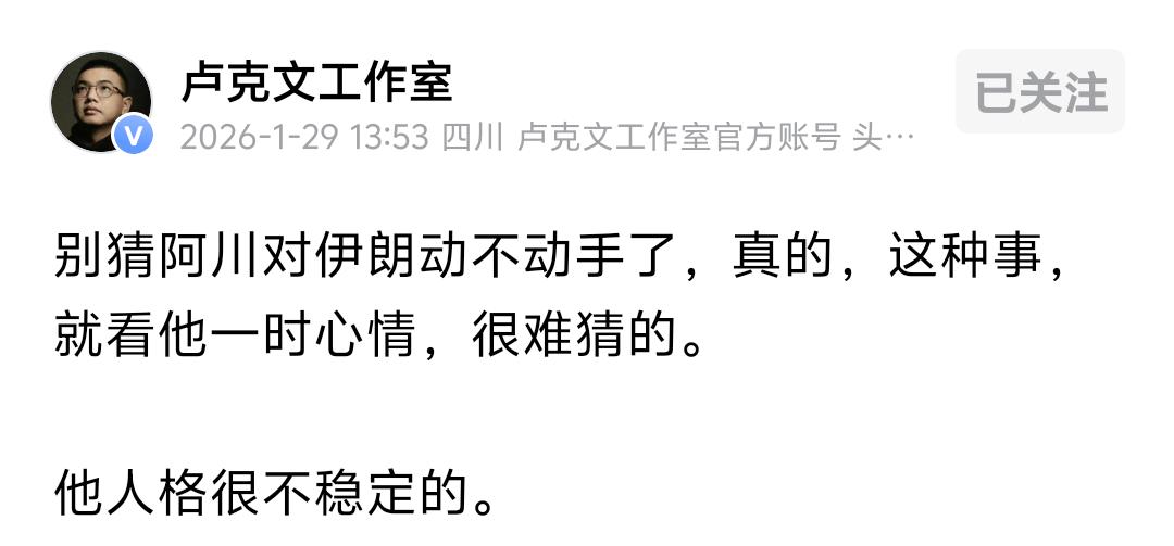 卢克文让大家不要去猜阿川会不会对伊朗动手,因为阿川人格不稳定,做事看心情。其实,阿川做事是有内在逻辑的:一是能收到钱吗?二是能一击必中吗?想想当年的苏莱曼尼,明晃晃的诱杀,不正是阿川下令干的?所以目前的可能性,就在于美方情报人员是否摸清了地堡的具体位置!