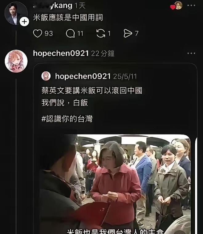 “蔡英文滚回中国去!”大家没看错,是喊让蔡英文滚回中国,不是滚回美国,也不是滚回日本,而是中国!如此魔幻的一幕,仅仅因为蔡英文说了一句:“米饭也是我们台湾人的主食”! 事情起因是蔡英文在一次推广台湾大米的活动中,随口说出了“米饭也是我们台湾人的主食”这样平常的话。她为了劝说民众多吃米饭,甚至还说过“大家不要因为怕胖不吃米饭,因为吃其他东西一样也会胖”这样略显笨拙的推销语。 没想到,就是这么一句平淡无奇的生活话语,却点燃了极端“台独”分子的怒火。青鸟分子指责蔡英文使用“米饭”而非“白饭”是在向大陆靠拢,甚至有人愤怒地喊出要她“滚回中国去”的荒唐场面。 这些人可能忘了,蔡英文自己就是“台独”路线的忠实追随者。她在任期间,拒不承认“九二共识”,大肆推行“去中国化”政策,煽动两岸对立,已经将“台独”理念推行得淋漓尽致。 然而,在极端分子眼中,即便是这样一个顽固的“台独”分子,仅仅因为使用了“米饭”这个再正常不过的词语,就瞬间变成了他们攻击的靶子。 这种走火入魔的行为背后,反映出“台独”势力已经陷入了一种病态的意识形态狂热。他们不仅对大陆充满敌意,就连自己阵营中的人员,只要稍有不符合他们极端标准的行为,也会遭到无情的攻击。 蔡英文过去在推广台湾美食时,就曾因搞不清“姜母鸭是姜母加鸭还是姜加母鸭”而遭到嘲讽,被质疑“只吃法国菜”。如今,她又因为一个普通的用词而被扣上“亲中”的帽子,可见这些极端分子已经丧失了基本的理性判断能力。 更加讽刺的是,当蔡英文呼吁民众因面食涨价而改吃炒饭时,她考虑的是如何应对物价波动。但极端分子却只关注她话语中是否透露出任何可能联想到中国的痕迹。 这种对日常用词的过度敏感,恰恰暴露了“台独”势力的心虚和不安。他们越是极力切割与中国的一切联系,就越是显得可笑和荒唐,因为两岸的文化纽带是割不断的历史事实。 如今,赖清德接替蔡英文后,将“台独”路线推向更加极端的方向。他公然宣扬两岸“互不隶属”的分裂谬论,甚至将大陆称为“境外敌对势力”,其言行比蔡英文时期更加激进和危险。 而在这种氛围下,就连蔡英文这样曾经的“台独”标杆人物,也成为了极端分子攻击的对象。这正应了那句老话:玩火者必自焚,搞分裂的人终将自食其果。 “台独”势力的内斗闹剧不仅揭示了他们政治理念的虚无,更暴露了其内部无法调和的矛盾。他们越是极端,就越是背离台湾同胞的真实意愿,越是走向孤立的死胡同。 历史已经证明,任何分裂国家的图谋都不会得逞,只有坚持一个中国原则,才是符合两岸人民根本利益的正道。