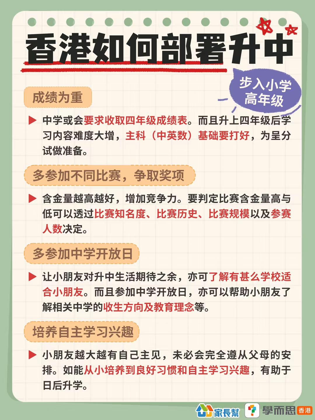想让香港升中更简单?建议4年级就开始准备 踏入高年级,不少家长都对于如何帮孩子规划升中感到疑虑🤔一方面是因为升中政策繁琐,家长可能会觉得很难理解,另一方面是因为不太清楚该从哪里入手🥺 其实家长和孩子可以从成绩、课外活动、了解中学资讯方面入手~逐步规划每个阶段要点什么,这样就不需要担心升中结果啦🥰 香港 香港升中 香港小升中 香港中学 香港小学 香港小学生 香港中学生 香港教育 香港呈分试