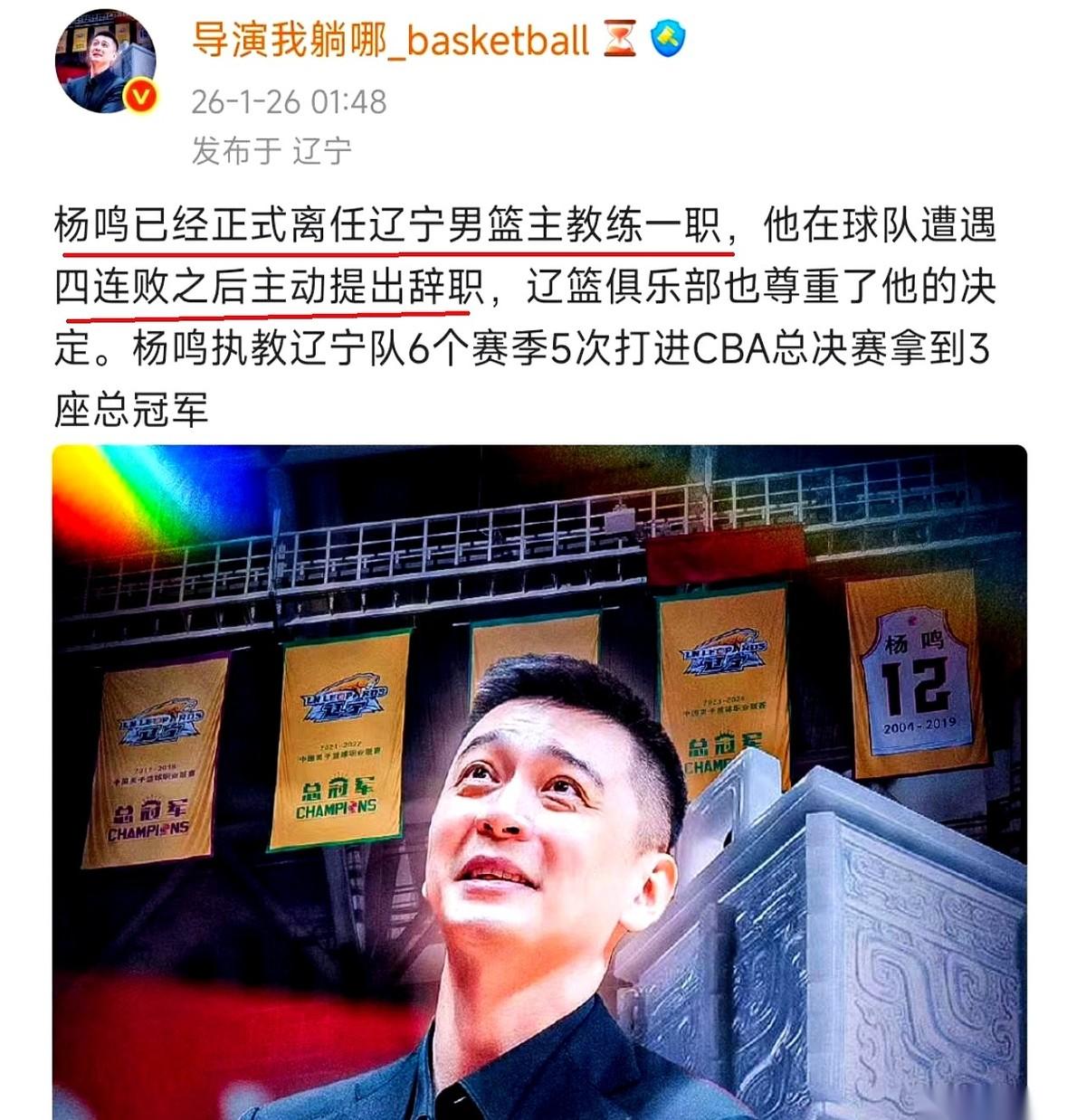 辽宁队主教练杨鸣,辞了。 就在他眼皮子底下,冠军球队在第四节,只拿了可怜的4分,整整一节,全队梦游。最后被新疆队血洗了19分。 赛后发布会他都没去,直接一份辞职报告,递到了俱乐部管理层手里。 管理层那边肯定想拦。毕竟是功勋教头,三连冠的奖杯还热乎着。但杨鸣话说得很死,这不是商量,就是个通知——他觉得已经带不动这支队伍了,再耗下去,就是互相耽误。 队伍需要新面孔,他也需要喘口气。 管理层看人去意已决,只能点头。 接替他的人,秒速就位。助理教练,乌戈。 最有意思的就是这个乌戈。两年前,正是他主动让贤,把主教练的位子腾出来给了杨鸣,这才有了后面的王朝三连冠。现在,风水轮流转,他又从杨鸣手里,接回了教鞭。 说白了,这哪是一次辞职。 这就是一次用自己的帅位,去敲打那帮在场上只拿了4分的功勋球员。