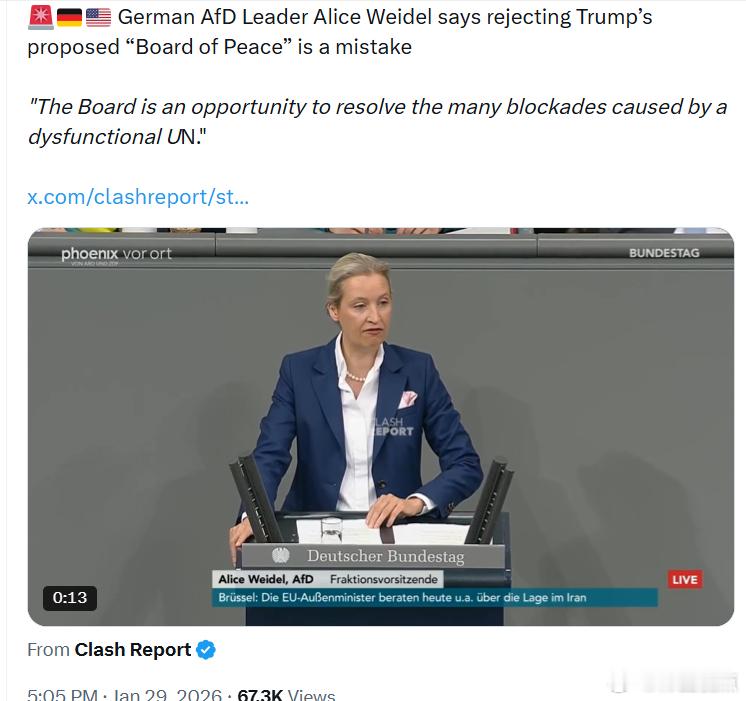 德国选择党岭导人爱丽丝·魏德尔表示,拒绝特朗普提出的“和.平.委员会”是一个错误。她说:“这个委员会是解决因功能失调的廉合国而造成的诸多僵局的一个机会。”