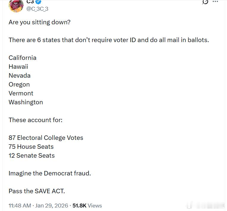 有6个州不要求选民出示身份证,并且大规模采用邮寄投票:加利福尼亚夏威夷内华达俄勒冈佛蒙特华盛顿这些州合计拥有:87 张选举人团票75 个众议院席位12 个参议院席位想一想民左党的舞弊。通过《SAVE 法案》!