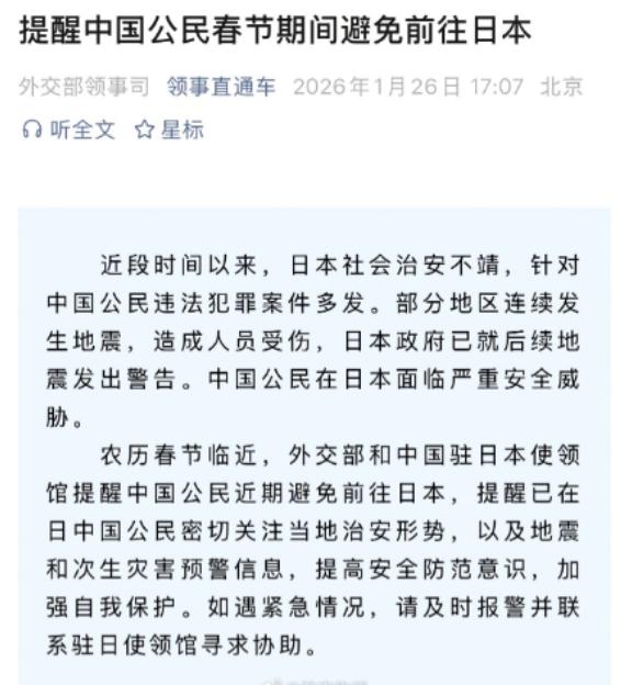 国家再次发出“预警”,春节期间不要前往日本,如果中日战争真的爆发了,那么那些留在日本的同胞大概率是回不来的。这已经是去年11月以来第三次发类似提醒了,要是没真风险,国家犯不着反复强调。   中日关系,向来复杂且敏感,犹如一部厚重的历史长卷,写满了恩怨情仇。   近代以来,日本曾对中国发动侵略战争,给中华民族带来了沉重且惨痛的灾难,那段血与泪的历史,深深烙印在每一个中国人的心中,成为难以磨灭的记忆。   尽管当下中日两国已建交,且在经贸、文化等多领域展开了一定交流合作,然而部分潜在矛盾与问题,如跗骨之蛆,始终萦绕不去,未能全然消弭。   于现实这方宏大舞台之上,国际形势如风云般诡谲多变,地缘政治冲突似浪潮般此起彼伏,在世界的广袤版图上不断演绎着复杂而激烈的篇章。   日本在军事安全政策方面不断进行调整,加强与美国的军事同盟关系,积极参与地区军事活动,其军事动向备受国际社会关注。   与此同时,日本在历史认知、领土纷争等领域的态度与举措,乖谬无状,屡屡致使中日两国龃龉不断、矛盾丛生,严重影响双边关系的和谐稳定。   国家反复发出预警,正是基于对这些历史和现实因素的全面、深入考量,敏锐地捕捉到了潜在风险的信号。   春节,身为华夏最为重要的传统佳节,宛如温馨的港湾,它是阖家团圆、齐聚一堂的珍贵契机,让亲人们于此时共享其乐融融的天伦之欢。   许多人会选择在春节期间出境旅游,放松身心,而日本凭借其独特的文化魅力、美丽的自然风景和丰富的旅游资源,成为了不少人心中的热门旅游目的地。   然而,当国家发布预警信号,此际,我们实有必要重新审慎考量这一出行抉择,切不可再盲目为之。   从经济层面来看,一旦中日关系紧张升级甚至爆发冲突,日本的旅游业将遭受毁灭性打击,交通、住宿等基础设施可能会陷入一片混乱,航班取消、酒店关闭等情况随时可能发生。   留在日本的同胞不仅可能面临人身安全威胁,还会遭遇经济上的重大损失,比如预订的酒店无法入住,行程取消导致的高额费用等,这些都将让同胞们陷入困境。   从社会层面分析,冲突爆发后,日本社会可能会出现动荡不安的局面,物资供应紧张、社会秩序混乱等问题可能接踵而至,这将极大地影响同胞们的日常生活和安全。   在这样混乱的环境中,同胞们可能会面临食物短缺、医疗资源匮乏等困境,生命安全受到严重威胁。   国家多次发布预警,此举措充分彰显了对民众生命安全的高度关切与深情呵护,展现出对人民生命至上理念的深刻践行,尽显大国担当与温情。   在复杂多变的国际形势下,国家有责任、有义务为民众提供准确的信息和必要的提醒,帮助民众做出理性、明智的决策。   作为民众,我们应该深刻理解国家的良苦用心,积极响应国家的号召,谨慎考虑春节期间的出行计划。   我们不能因为一时的旅游热情,就忽视了潜在的风险,要树立国家安全意识和大局观,明白个人的安全与国家的稳定息息相关。   选择旅游目的地之际,需全面知悉当地政治、社会状况与安全形势,应审慎考量,规避前往存有风险的地区,如此方能确保旅途顺遂无忧。   同时,我们也可以通过其他丰富多彩的方式度过一个欢乐、祥和的春节,比如与家人一起在家中团聚,共享温馨的年夜饭,参加社区组织的各种活动,感受浓浓的节日氛围。   在我看来,国家的预警绝非空穴来风,而是基于对国际形势的深入分析和对民众安全的负责态度,我们生活在一个全球化的时代,国际形势的变化与我们每个人的生活都紧密相连。   面对国家的预警,我们不能掉以轻心,更不能抱有侥幸心理,作为个体,我们要增强风险意识和安全意识,听从国家的建议,合理安排自己的生活。   同时,我们也应该关注国际形势的发展,了解国家之间的关系动态,以更加理性和成熟的心态看待国际事务。   只有国家稳定、安全,我们才能拥有幸福、美好的生活,让我们共同珍惜和平,为国家的发展和繁荣贡献自己的力量。
