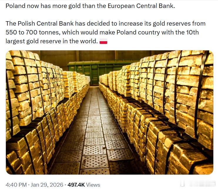 波兰拥有的黄金储备超过欧洲央行。波兰中央银行决定将黄金储备从550吨增加到700吨,这将使波兰成为全球黄金储备排名第10的国家。