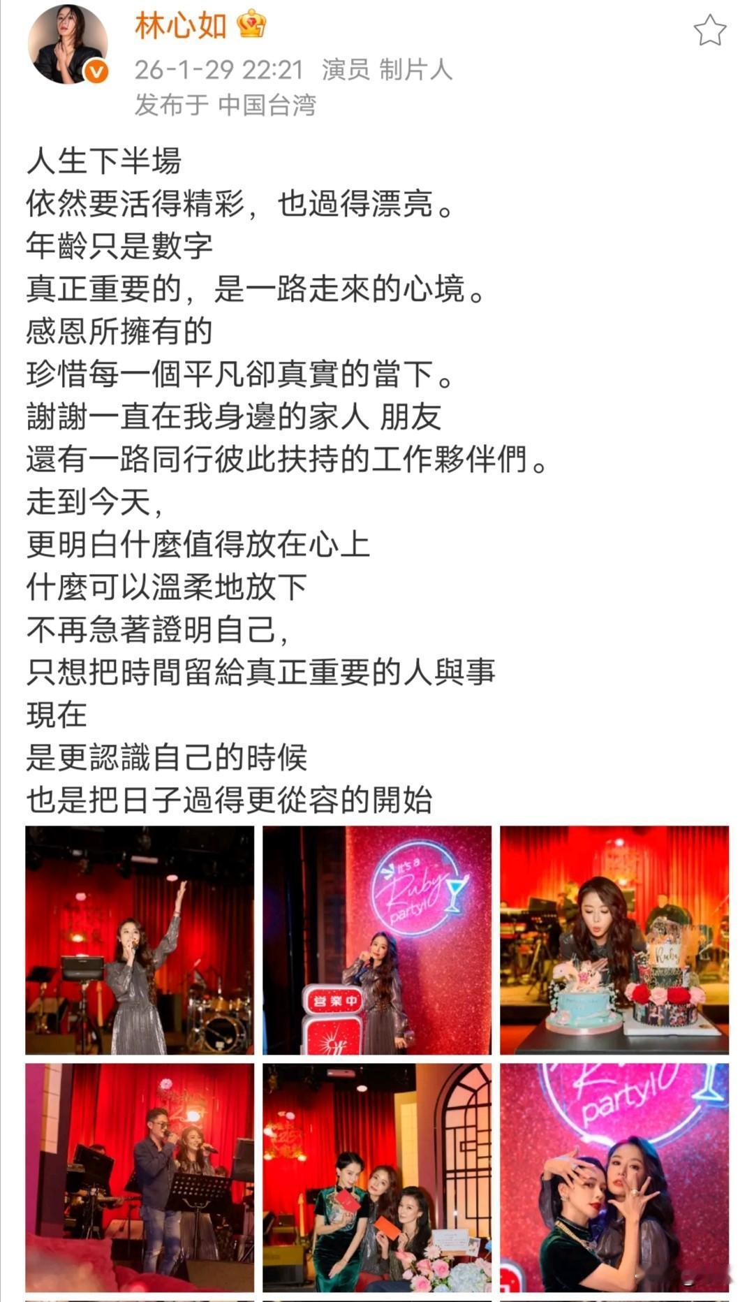 林心如庆祝50岁生日,身边有老公霍建华、好友林熙蕾、徐若瑄、许玮甯作陪,蛋糕+鲜花,氛围满满! 林心如一袭鎏金色长裙,深棕色大波浪,女人味十足,她称:“人生下半场,年龄只是数字,真正重要的,是一路走来的心境。走到今天,更明白什麼值得放在心上,什么可以温柔地放下!”林心如