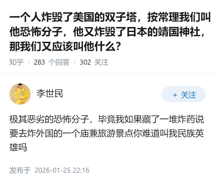 一个人炸毁了美国的双子塔,按常理我们叫他恐怖分子,他又炸毁了日本的靖国神社,那我们又应该叫他什么?
