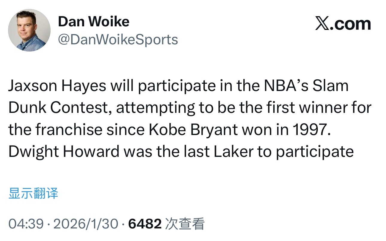 据Shams和湖人跟队记者报道,海斯接受邀请将参加今年全明星扣篮大赛!