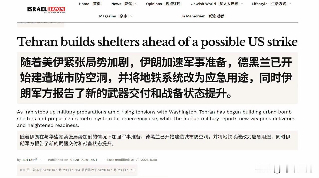 🔻德黑兰市长阿里雷扎·扎卡尼宣布,若与以色列和美国重新爆发敌对行动,全市的地下停车场和地铁站将转变为"战时避难所"。 🔻我不记得在“12 日战争”或“午夜铁锤”行动之前有过类似的声明。与去年夏天相比,这次伊朗方面的言辞和准备工作似乎有所不同。 🔻据路透社援引消息人士的话称,特朗普正考虑对伊朗领导层发动精准打击,以激励伊朗抗议者占领伊朗政府机构。 伊朗革命卫队海军部队将于 2 月 1 日和 2 月 2 日在霍尔木兹海峡举行实弹演习。