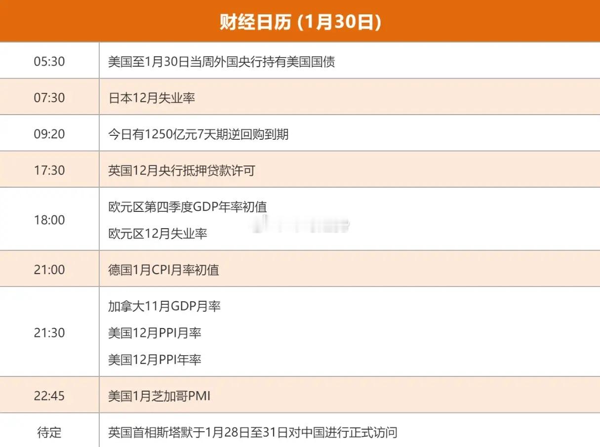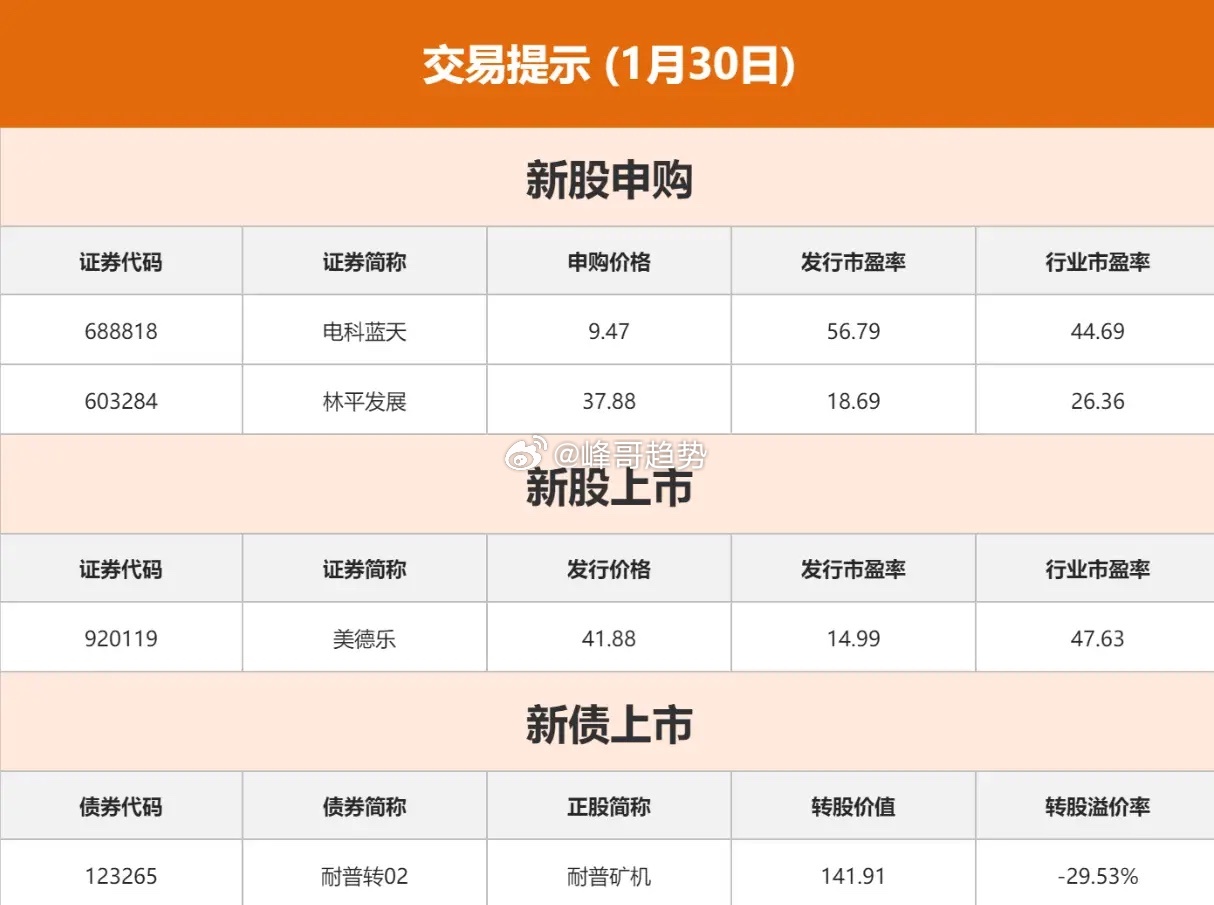 1.30股市早知道:1、外盘汇总:纳指大跌后回,如图一。 2、交易提示:如图二。 3、财经日历:如图三。 4、三大指数:1)大盘:继续看涨2)创指:新目标34703)科创50:兑现1500,再看1588 5、重要新闻:1)国办印发《加快培育服务消费新增长点工作方案》;2)国家统计局:2026年将完善有利于统一大市场建设的统计制度。 6、市场动态:1)我国首个设在飞机内的医疗执业点-“飞机医院”在上海获批;2)河南:深入实施高标准农田建设、粮油作物单产提升、设施农业更新改造“三大行动”;3)昆山设立人工智能产业基金,总规模50亿元。 7、公司公告:1)宁波韵升:2025年净利同比预增194.49%-299.67%;2)福田汽车:2025年净利同比预增1551%左右;3)盘江股份:2025年净利同比预增205.30%-264.83%;4)美克家居:预计2025年净利润亏损12亿元-18亿元;5)蓝色光标:预计2025年净利润1.8亿元-2.2亿元,同比扭亏为盈;6)天齐锂业:预计2025年净利润3.69亿元-5.53亿元,同比扭亏;7)顺鑫农业:预计2025年净利润亏损1.16亿元-1.88亿元,同比转亏;8)明阳电路:2025年净利同比预增585.19%-734.52%。(关注点赞+评论,陪你一起到牛市)财经今日A股优质财经分享黄金暴跌