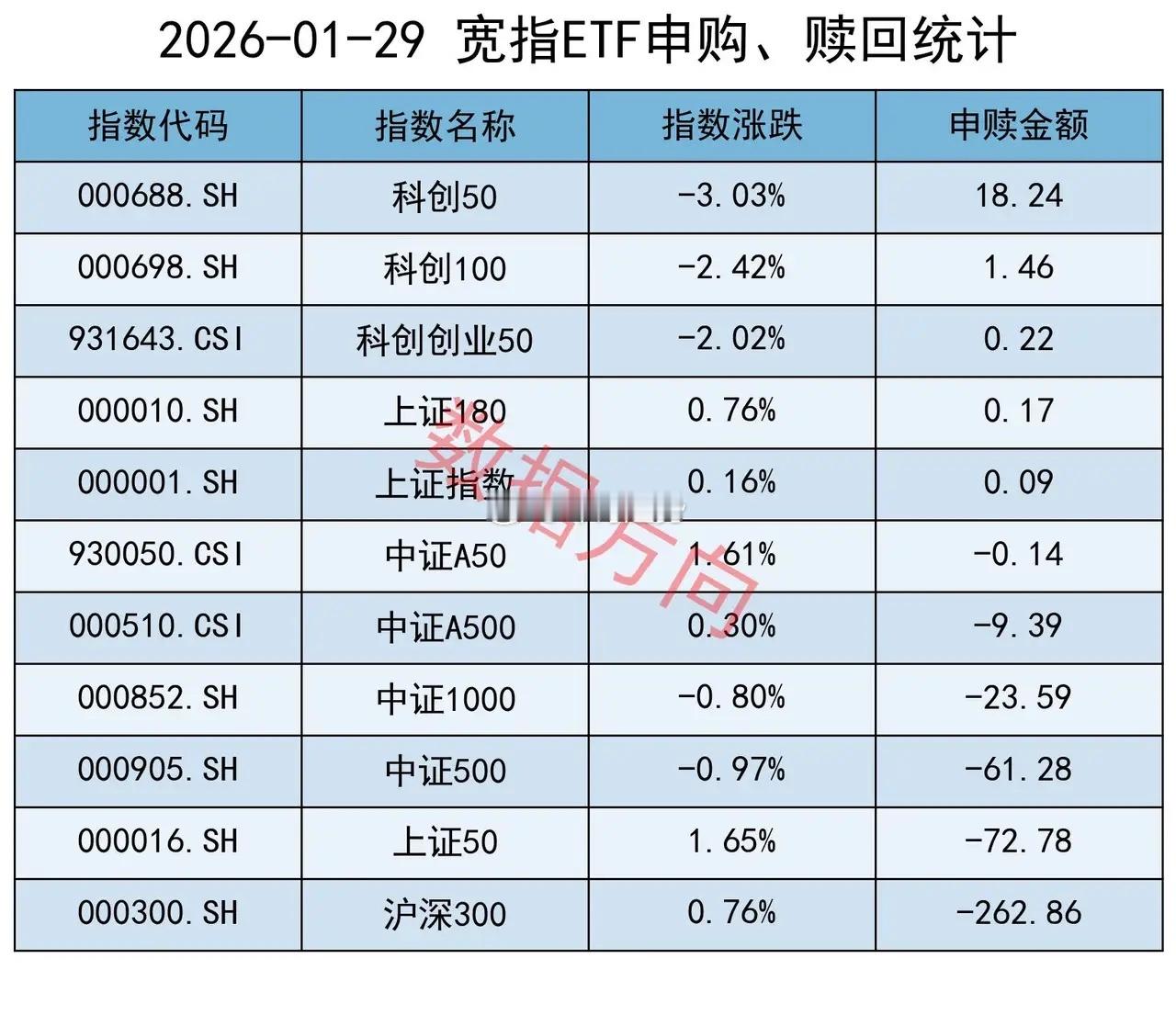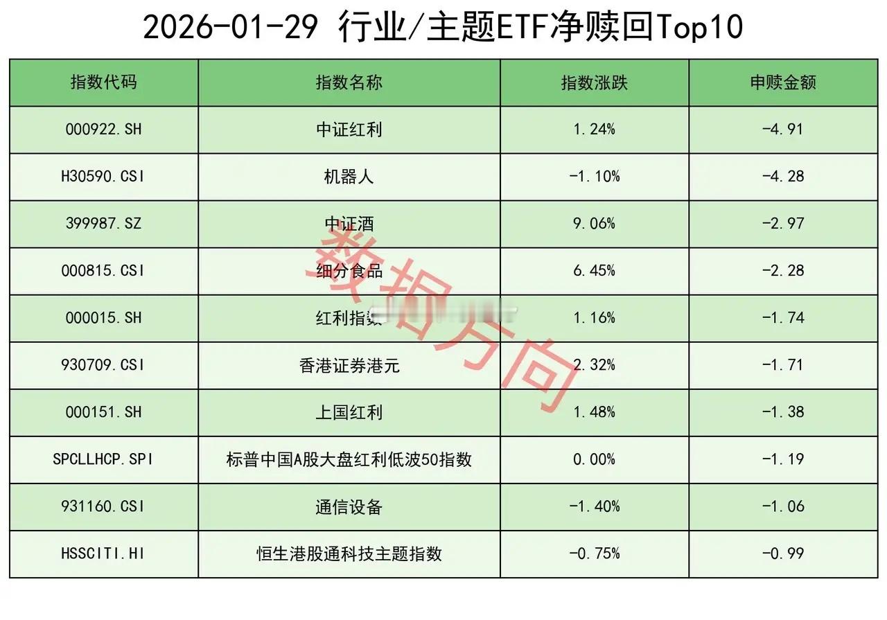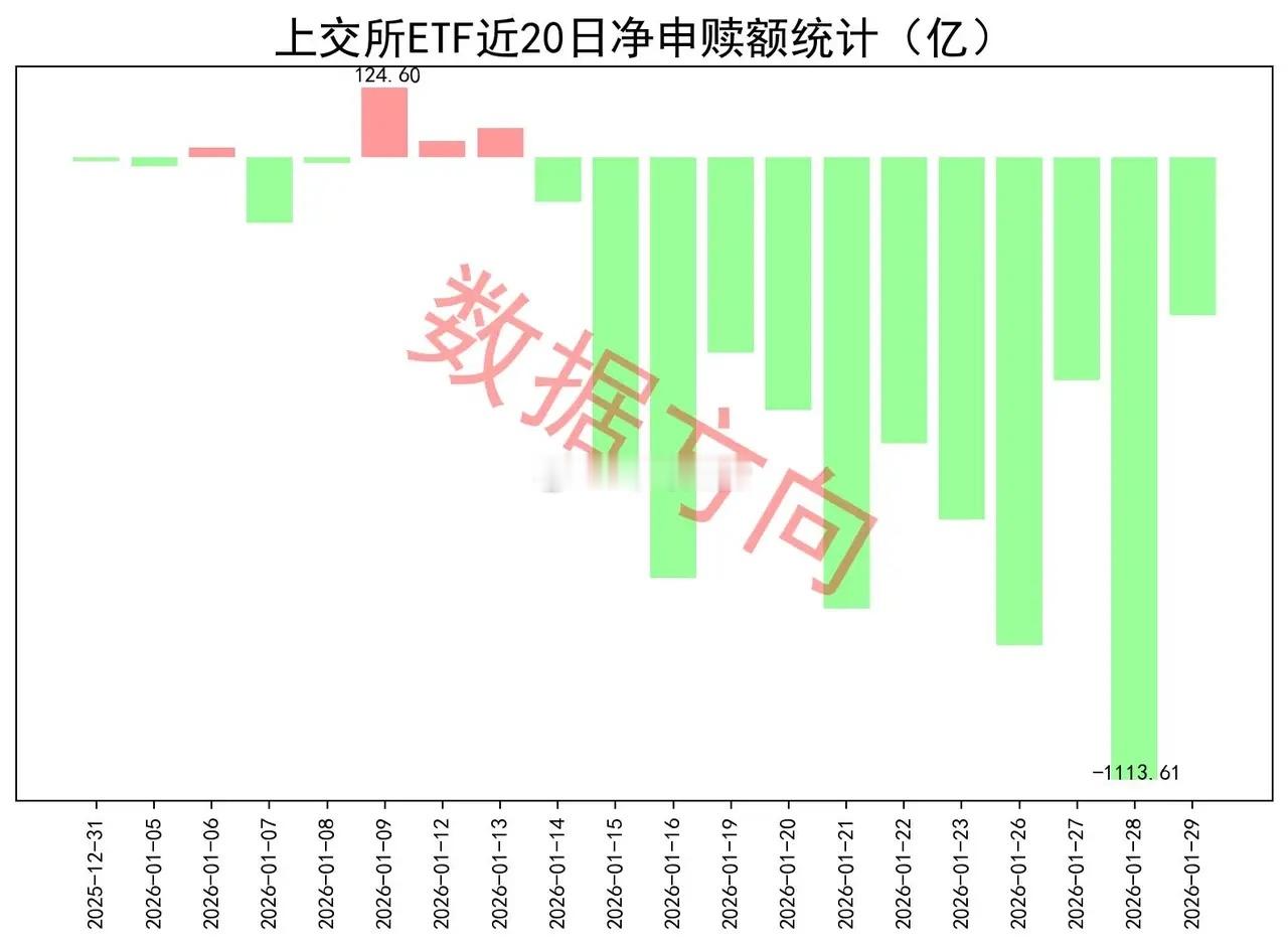 大资金再卖280亿1月29日星期四,A股全天震荡分化,大盘股涨、中小盘股跌,除了贵金属延续强势外,白酒板块于午后全线爆发。上证指数涨幅0.16%,上交所ETF合计净赎回283.79亿元,和前面10天相比力度稍小了一些。昨天的盘面并不好,白酒板块接接涨停才勉强把指数拉红,如果继续像前面几天那样大幅净赎回,可能就扛不住了。即便如此,283.79亿也不是一个小金额。1层于1月15日开始大幅减持。前面8天,大盘股承压,中小盘股全线飞扬,显示市场交投活跃,仍然延续了之前的惯性;从本周二开始,卖压开始传导至中小盘股,大资金不得不先后启动油气、银行、房地产、白酒等权重品种,才能稳住市场。有色金属的强,是受了国际大宗商品走势的影响。从这里可以看出1层的态度,要减持,也要确保市场稳定。最终市场会如何运行?首先等本轮减持结束,然后再看。宽指沪深300指数(-262.86亿),净赎回最多。上证50指数(-72.78亿)、中证500指数(-61.28亿),净赎回都在60亿之上。中证1000指数(-23.59亿)、中证A500指数(-9.39亿),净赎回都在9亿之上。中证A50指数(-0.14亿),被小幅净赎回。科创50指数(18.24亿),净申购近20亿。科创100指数(1.46亿)、科创创业50指数(0.22亿)、上证180指数(0.17亿)、上证指数(0.09亿),分别获小幅净申购。行业和主题 科创芯片指数(24.36亿)、半导体指数(8.11亿)、科创半导体材料设备指数(3.89亿),一起进入申购榜。有色金属指数(16.99亿)、细分有色指数(14.75亿)、SSH黄金股票指数(13.5亿)、油气产业指数(8.77亿)、细分化工指数(7.6亿),一起进入申购榜。其他进入申购榜的还有:房地产指数(7.27亿)、港股通非银人民币指数(3.78亿)。中证红利指数(-4.91亿)、红利指数(-1.74亿)、上国红利指数(-1.38亿)、标普中国A股大盘红利低波50指数(-1.19亿),一起进入赎回榜。中证酒指数(-2.97亿)、细分食品指数(-2.28亿),一起进入赎回榜。白酒被拉冒烟了,股价高于ETF,于是有了套利的机会。其他进入赎回榜的还有:机器人指数(-4.28亿)、香港证券港元指数(-1.71亿)、通信设备指数(-1.06亿)、恒生港股通科技主题指数(-0.99亿)。ETF男演员9公斤黄金400元每克卖出