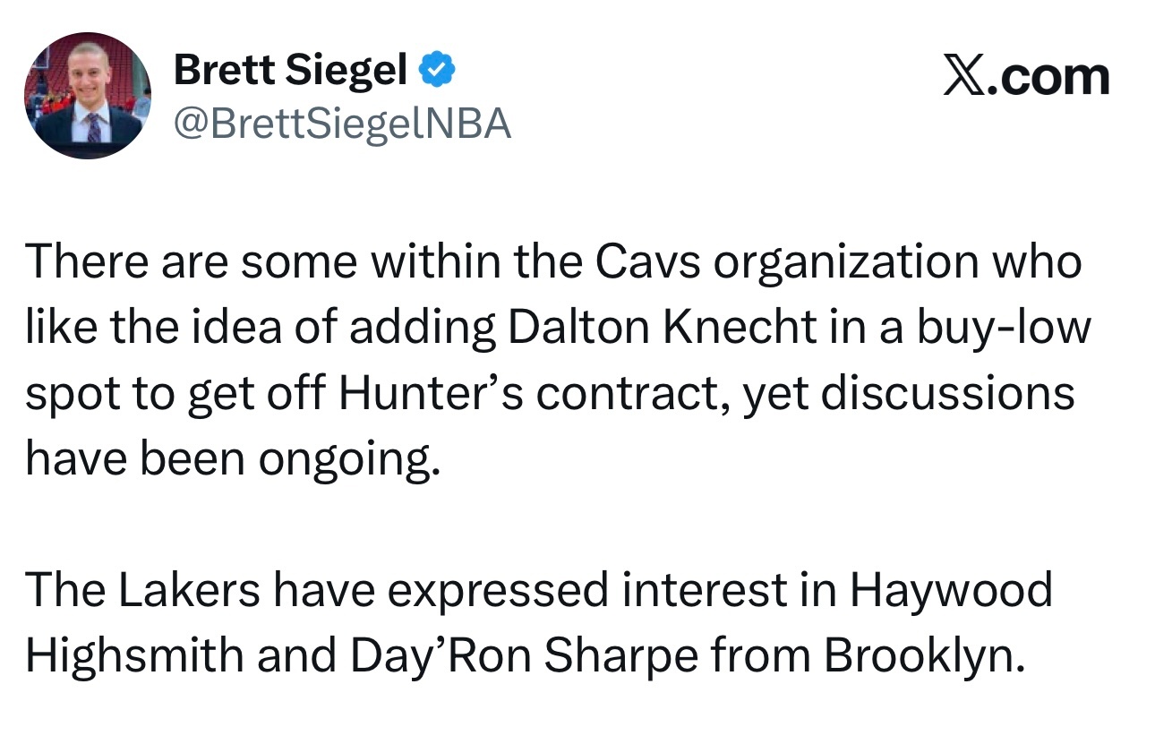 记者Brett Siegel:骑士队内部有一部分人支持用低价得到克内克特的同时甩掉德安德烈·亨特的合同,相关讨论目前还在持续进行中。另外,湖人已经表达了对篮网侧翼海史密斯和中锋夏普的兴趣。