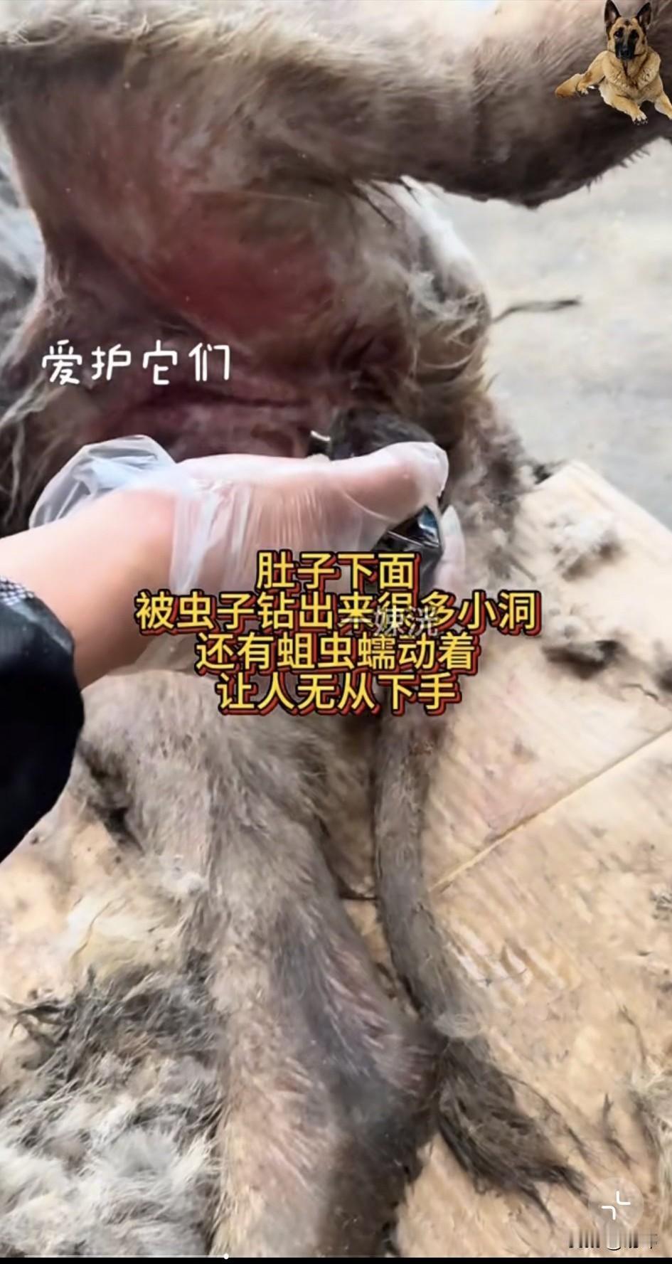 太可怜了!这是一只放了一辈子羊的牧羊犬,因为年龄太大,已经无法走路了,而且很多伤口都发炎长虫了,主人居然无情的把卖给了狗肉馆。幸好一位路过的小哥哥非常同情它的遭遇,于是就把它买了下来。 当时它像个老人一样,紧挨着主人的车子,生怕把它丢下,可无情的主人还是骑上车离去了,狗狗看着他离去的背影,或许也有不舍吧!好在小哥哥是真心对它好,把它带去医院医院治疗,它的肚子下面被虫子钻出很多洞,还有虫在里面,很难处理,不过最终还是给它清理干净了,小哥哥也不知道它能活多久,如果救不好,起码他们努力过了,也能给它最后的体面了。