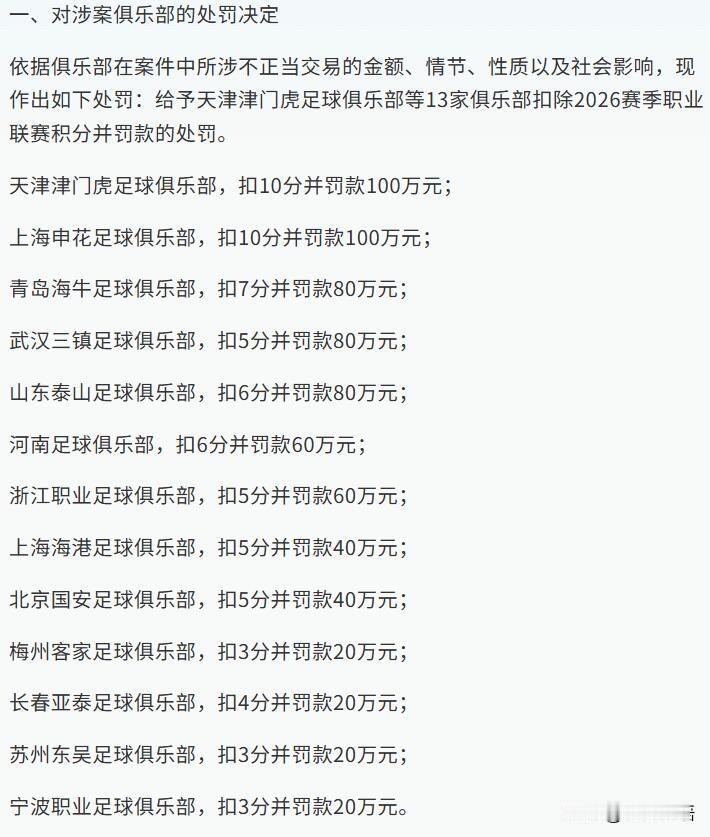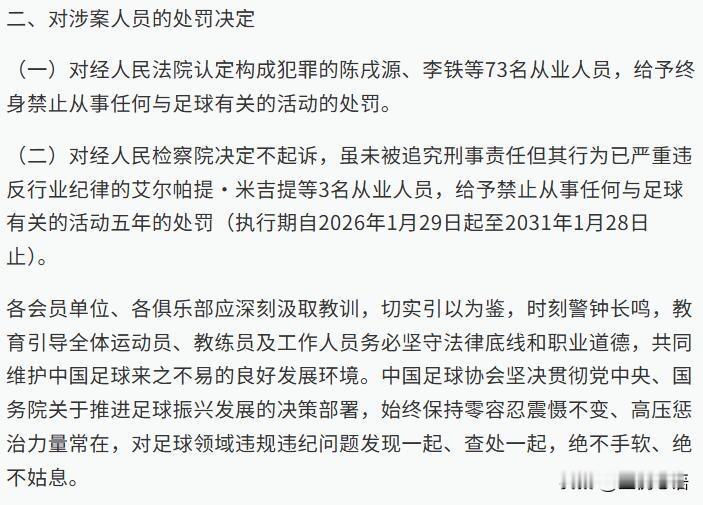 大快人心!足坛这波处罚太解气! 家人们!昨天足坛的罚单看得我热血沸腾! 1月29日三部门联合发布会,李铁、陈戌源等73人直接被终身禁足了! 这些人搞受贿、操控比赛,早该被收拾了! 还有13家俱乐部也被罚了,申花和津门虎扣10分还罚100万! 像泰山、国安这些眼熟的球队,也都有扣分罚款。 之前看球总觉得有些比赛不对劲,猫腻太多让球迷寒心。 这波处罚真的是刮骨疗毒,从高层到相关人员全链条问责。 可不是走过场,这力度才对得起熬夜看球的我们。 零容忍就该是这个样子! 希望这是中国足球的新开始,把蛀虫清干净,未来才能好好搞青训、拼赛场。
