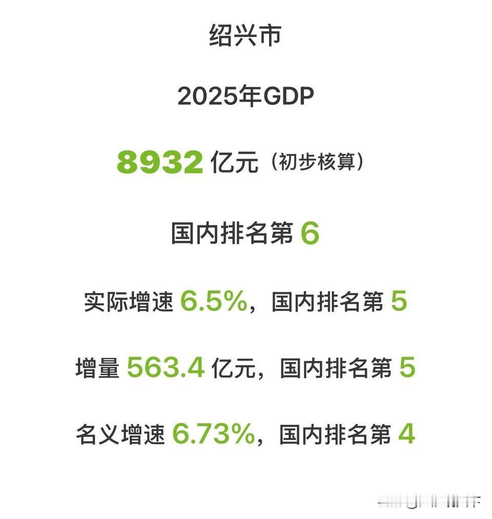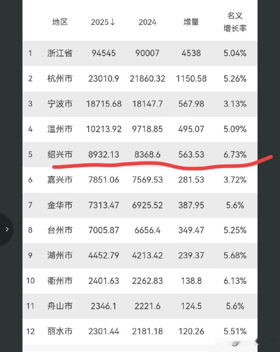 绍兴市,浙江省未来第4座万亿城市,发展潜力巨大 提起江浙沪,那就是富裕有钱的代名词,2025年江苏省已经官宣5座城市迈入万亿大关,徐州大概率会成为江苏省第6座万亿城市,南京,苏州,无锡,常州,南通,徐州,13个地级市,6个超万亿,并且还有苏州这座超2万亿的巨无霸城市,南京接近2万亿,江苏经济实力太恐怖。 浙江省的温州市在2025年成功迈入万亿城市俱乐部,形成了杭州,宁波,温州三强鼎立的局面。 浙江省只有11个地级市,3个城市超万亿,绍兴是万亿后备军城市,绍兴只有543万人口,创造出8932亿的gdp,一年增量高达563亿,名义增速6.73%。 按照绍兴的发展水平,最快2027年,绍兴就能成为浙江省第4座万亿城市,非常牛[赞]绍兴 浙江城市排行 浙江城市 诸暨城市发展 绍兴城市地图