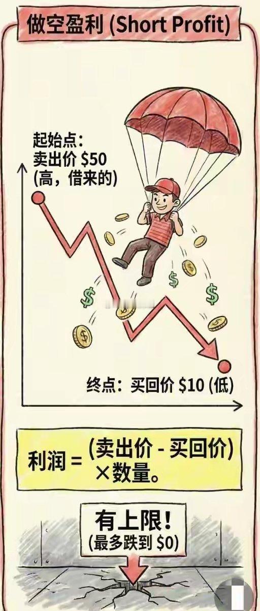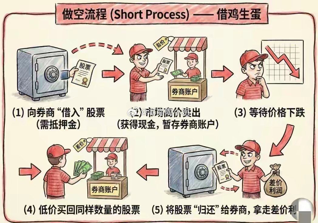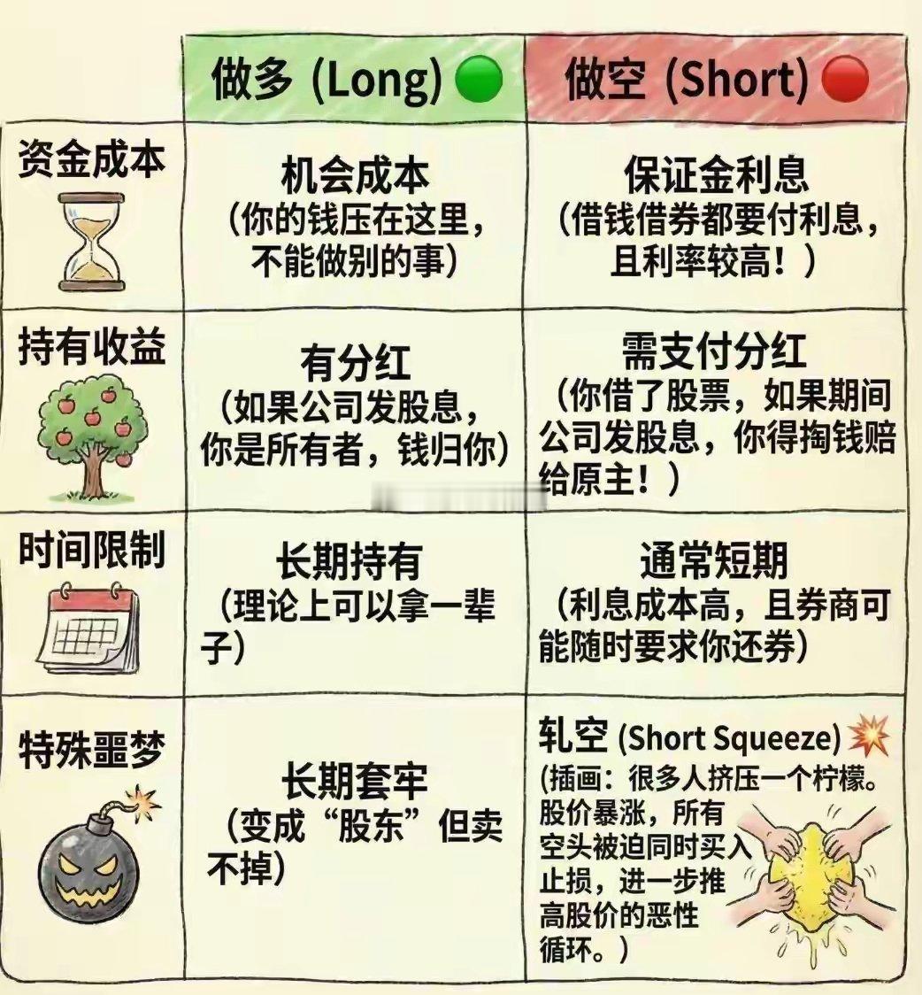 很多人以为炒股只能“低买高卖”赚钱,其实交易的世界里,上涨和下跌都能获利——这就是做多与做空的核心区别。前者是普通人的“基本操作”,后者是高手的“高阶玩法”,但两者的风险和收益逻辑天差地别。做多:时间的朋友,简单直接的盈利做多是最经典的交易方式,本质是“看涨未来”。你认为某只股票未来会更值钱,现在用现金买入,持有等待价格上涨后卖出,赚的是“低买高卖”的差价。这个过程就像买了一颗种子,等待它长成大树后再出售。做多的盈利空间理论上“上不封顶”,只要股价持续上涨,收益就会不断扩大。而风险却相对可控,最坏情况是公司破产、股价跌到0,亏损最多就是你投入的本金。此外,做多还能享受分红收益,长期持有甚至可以伴随公司成长,是时间的朋友。做空:时间的敌人,借鸡生蛋的博弈做空是“看跌未来”的高阶玩法,核心是“借鸡生蛋”。你认为某只股票现在太贵、未来会贬值,先向券商借入股票,在当前高价卖出,拿到现金后等待股价下跌,再以低价买回同样数量的股票还给券商,赚的是“高卖低买”的差价。做空的盈利空间是有限的,因为股价最多跌到0,收益不会无限扩大。但风险却“理论上无限”:如果股价因利好消息或“轧空”而暴涨,你必须以天价买回股票还债,亏损可能远超本金,甚至直接爆仓。更麻烦的是,做空需要支付保证金利息和分红补偿,且券商可能随时要求还券,通常只能短期操作,是时间的敌人。核心区别:风险与收益的天壤之别- 盈利逻辑:做多赚上涨的钱,做空赚下跌的钱;- 风险上限:做多亏损有限(最多亏光本金),做空亏损无限(可能爆仓);- 时间属性:做多是时间的朋友,长期持有可享复利;做空是时间的敌人,利息成本高且有还券压力;- 特殊风险:做多最怕“长期套牢”,做空最怕“轧空”——股价暴涨时所有空头被迫买入止损,进一步推高股价的恶性循环。对于普通投资者来说,做多是更稳妥的选择,符合“买好公司、长期持有”的投资逻辑;而做空更适合专业交易者,需要精准的时机判断和强大的风险承受能力。无论选择哪种方式,记住交易的本质是概率游戏,看懂规则、控制风险,才能在市场中活得更久。风险提示:本文仅为交易知识科普,不构成任何投资建议,市场有风险,投资需谨慎。作品声明:内容仅供参考,不构成投资建议