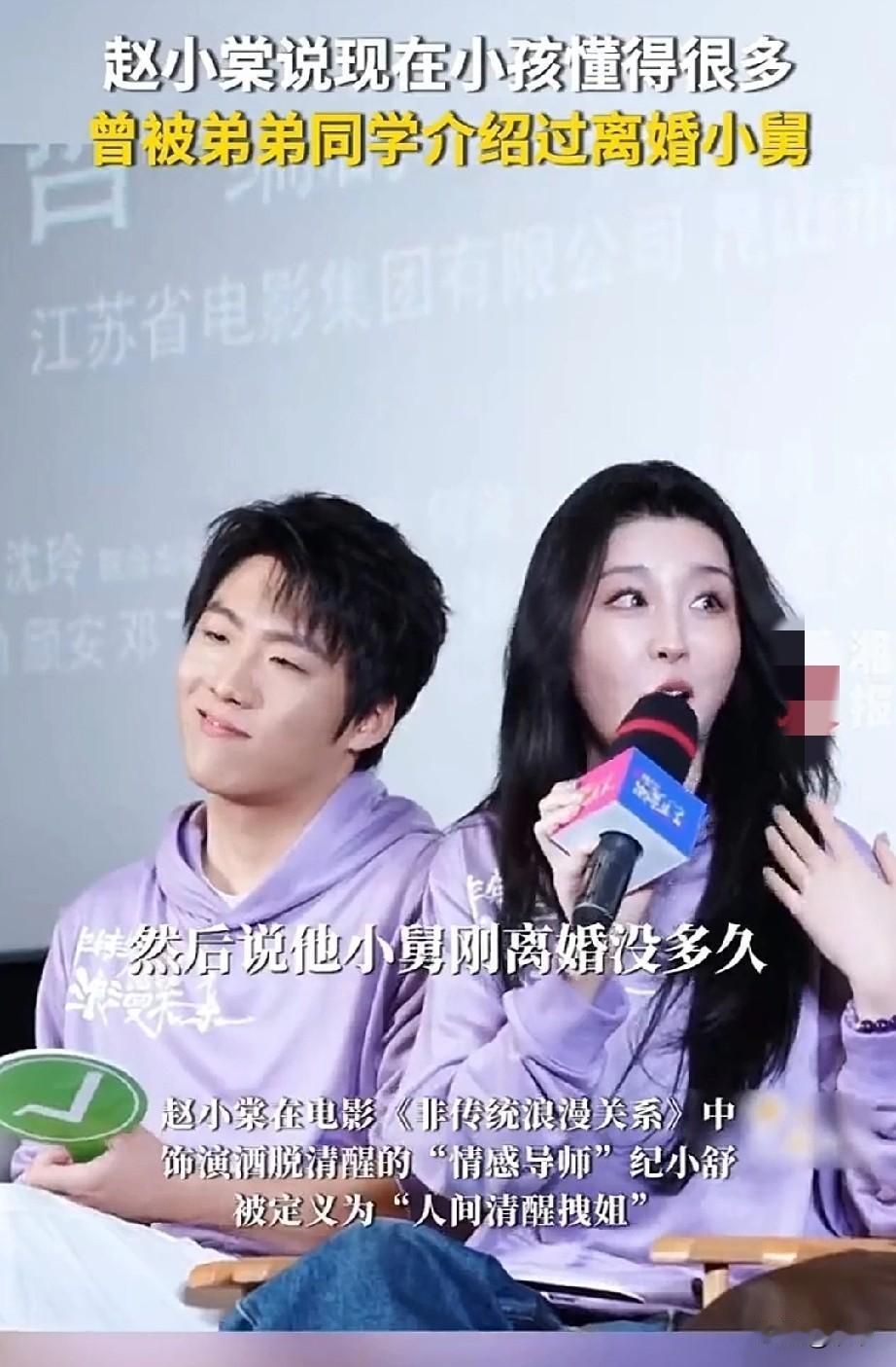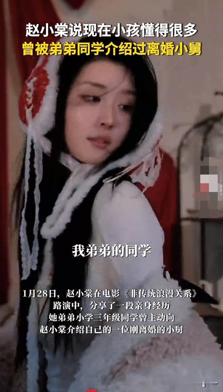 美女演员赵小棠在电影发布会现场是真的敢说,她说现在小学生懂得非常多,旁边的男搭档咧嘴开笑! 因为他知道赵小棠又开始开火车,她说有一次去看弟弟,刚好碰到了弟弟的小学同学! 然后他弟弟的同学给问她有没有男朋友?没有的话,可以给他介绍自己离婚的小舅!还说他的小舅非常的帅气! 赵小棠直接就被逗笑了,这直接反映出来现在的儿童对于成年人的世界非常关注,他们对于成年人的关系超出预期! 他们很小就知道了离婚,结婚这些事儿,因为现在的网络太发达了,很多小孩子提早就接触! 在大人眼中非常混乱的关系,在他们眼中跟明镜似的!她在电影中饰演情感拽姐,是现实生活中却被小学生追着介绍对象!还是真是有趣的经历! 大家对于赵小棠分享这段趣事怎么看? 娱乐圈每日热议 赵小棠演技 赵小棠吻戏 赵小棠生日会 赵小棠 高定礼